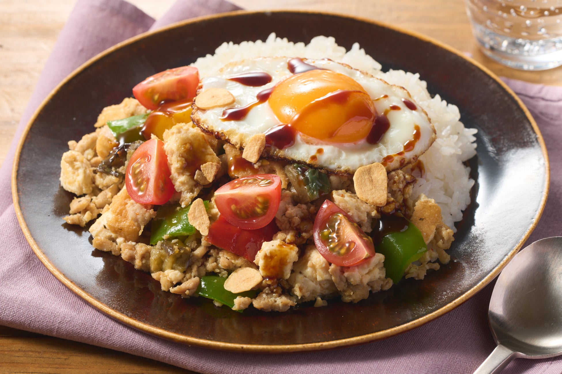 概要:エスニックメニューのガパオライスを、家族みんなで楽しめるよう厚揚げを加えてやさしい味わいに仕上げました。最初に厚揚げを袋の中で細かく崩すことで、他の具材ともなじみやすく、時短にもつながります。カリっと焼いた目玉焼きや仕上げのオイスターソース、ごはんに振りかけるフライドオニオンがアクセントになり、食べ飽きないおいしさです。
