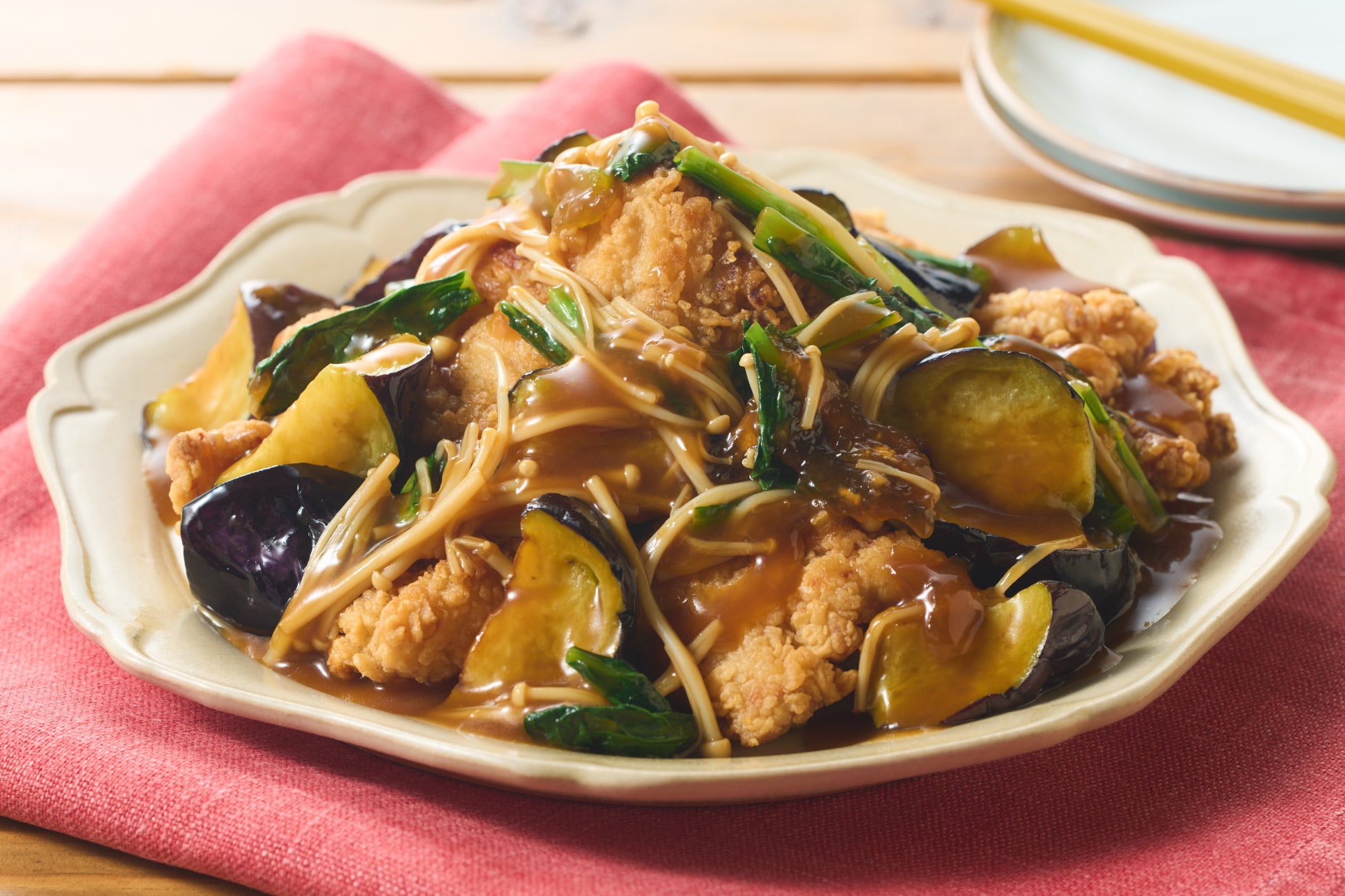概要:コクと旨みあふれる特製オイスターソースをベースに、香味野菜の風味を効かせた野菜入り中華あんです。鶏唐揚げとよくからめて、ごはんを片手にお召し上がりください。