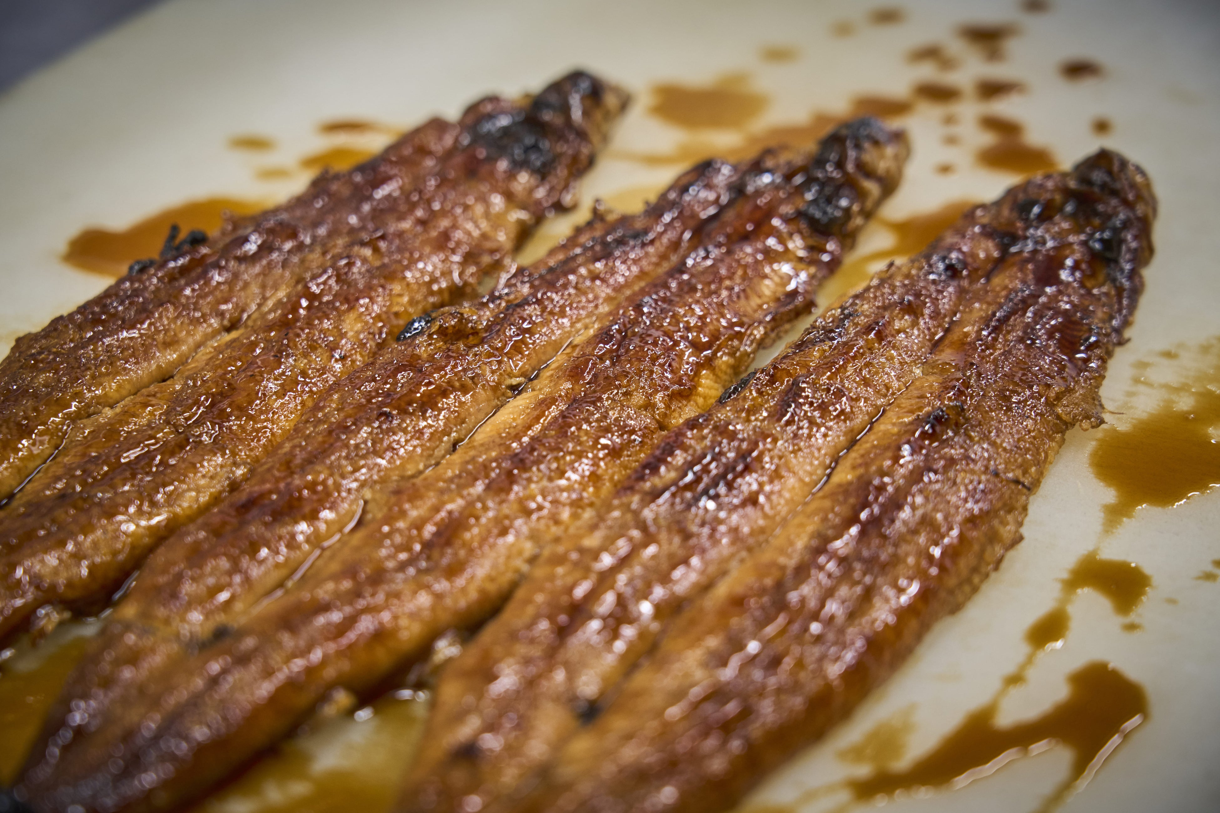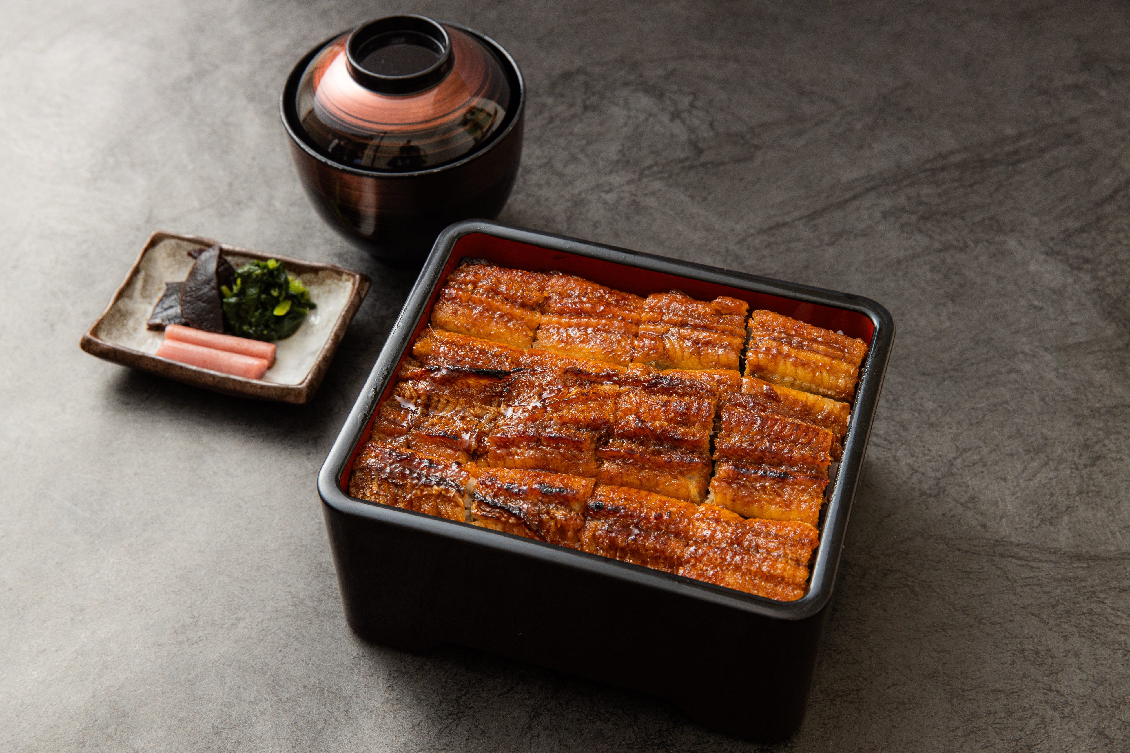 生から高温で香ばしく焼き上げたうなぎに、秘伝のタレを重ね焼き。