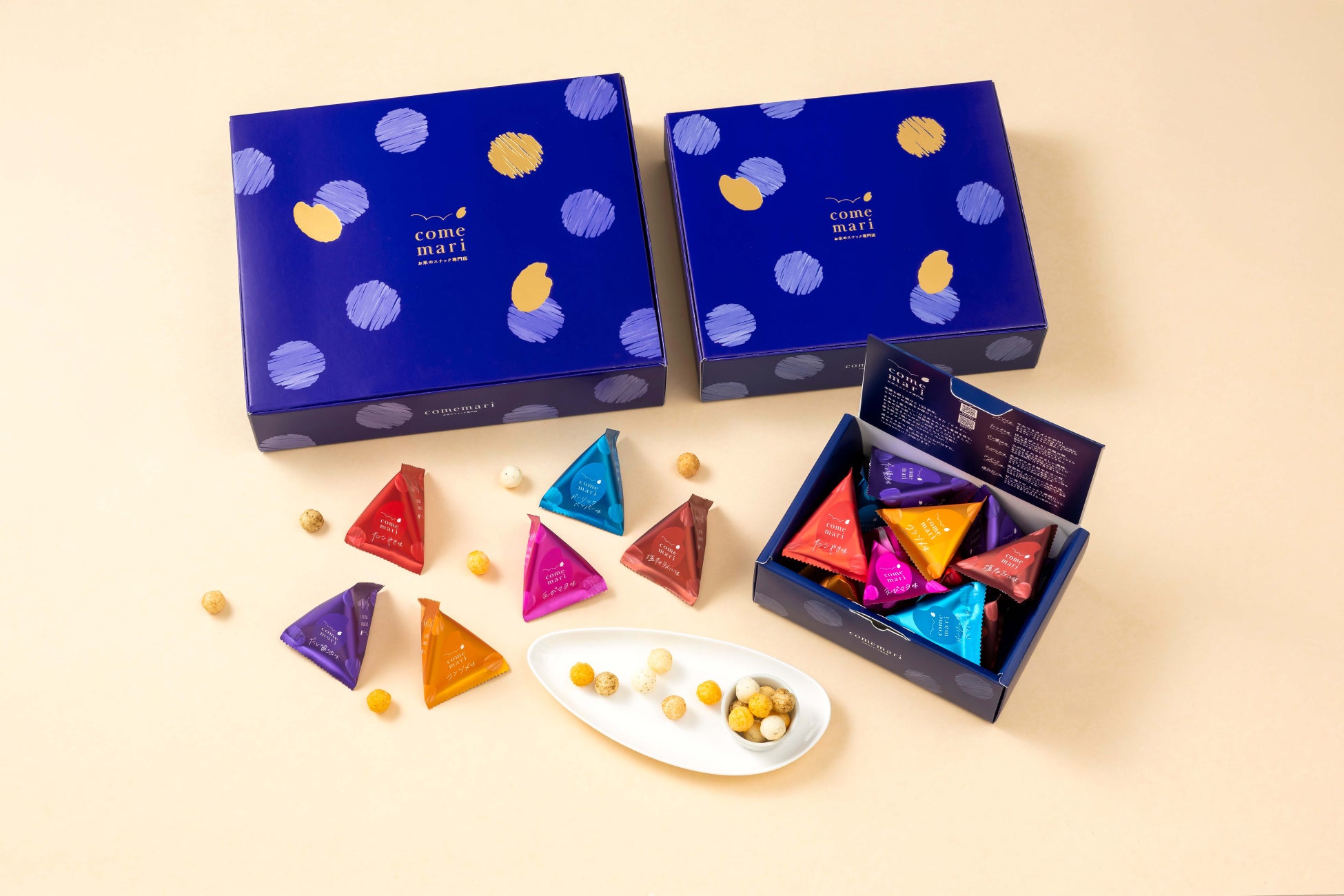 国産うるち米を100%使用した、軽やかでサックサクの食感に、コロコロと転がる“鞠”を思わせる、見た目にも愛らしい小粒なサイズ感。選ぶ時間まで楽しくなるフレーバーラインナップや、気分を明るく彩るカラフルな個包装が覗く透明パッケージにも、「comemari(こめまり)」ならではのこだわりを込めました。