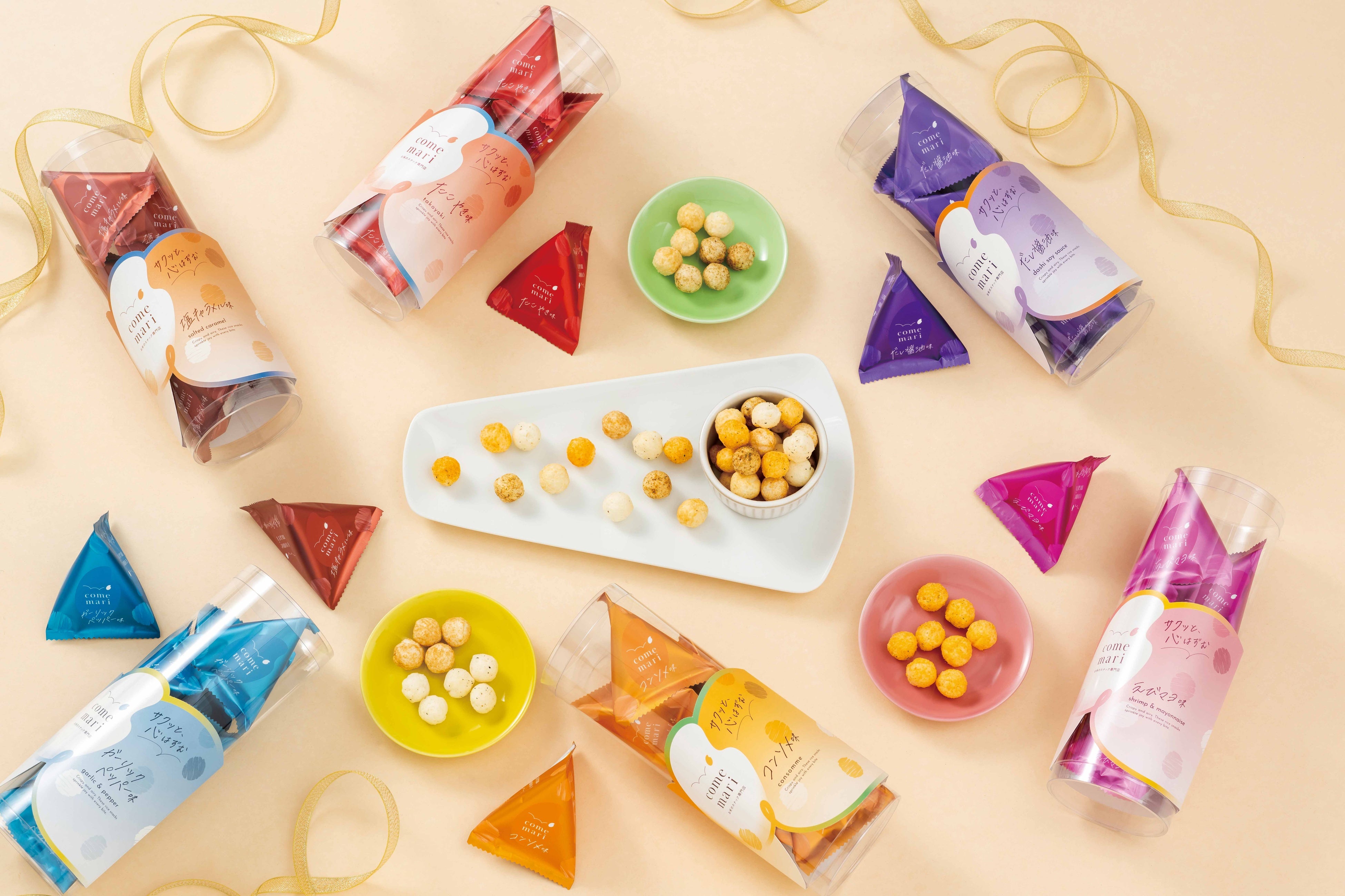 国産うるち米を100%使用した、軽やかでサックサクの食感に、コロコロと転がる“鞠”を思わせる、見た目にも愛らしい小粒なサイズ感。選ぶ時間まで楽しくなるフレーバーラインナップや、気分を明るく彩るカラフルな個包装が覗く透明パッケージにも、「comemari(こめまり)」ならではのこだわりを込めました。