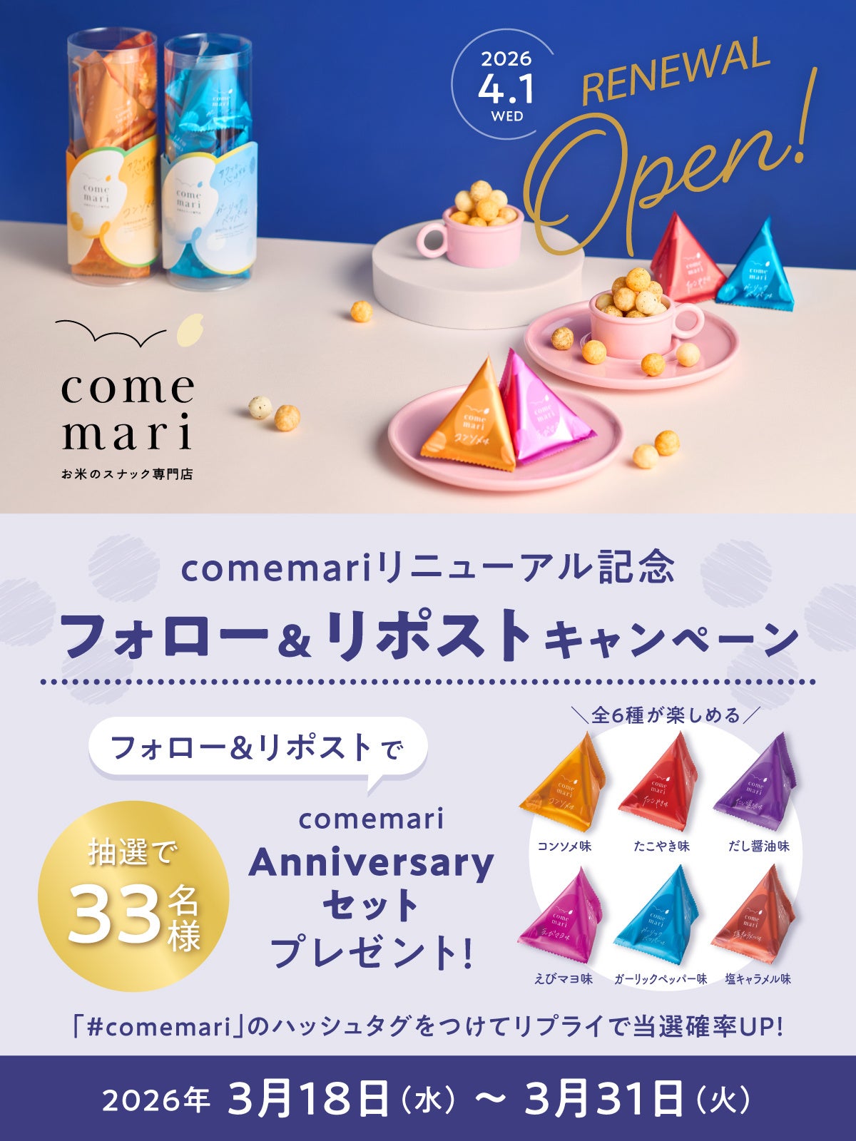 お米のスナック専門店「comemari(こめまり)」は、2023年4月にオープン以来、阪急うめだ本店限定ブランドとして、ギフトやお手土産に幅広くご利用いただいてきました。3周年の節目を迎えるにあたり、より多くのお客様との新たな出会いを生み出すため、コンセプト・製品・パッケージを刷新いたします。