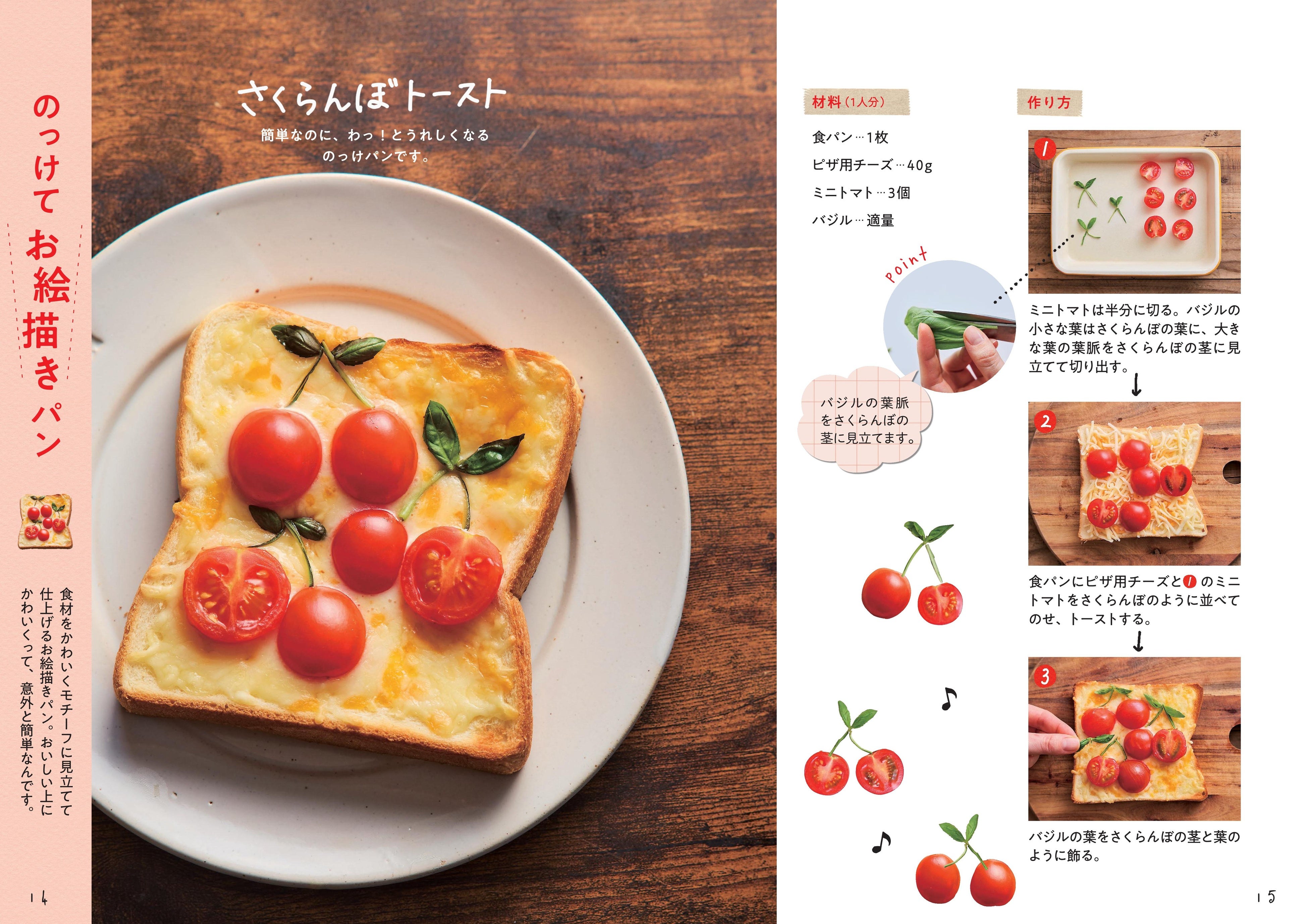 ・さくらんぼトースト ・のりマヨパン ・ねぎカマンベールトースト ・アジフライと梅マヨ大葉のっけパン ・即席トマトソースでトマトとモッツァレラトースト ・クロックマダム風トースト ・えびブロッコリーたくあんサンドパン ・ハニーバタートースト ・焼きいもアイストースト