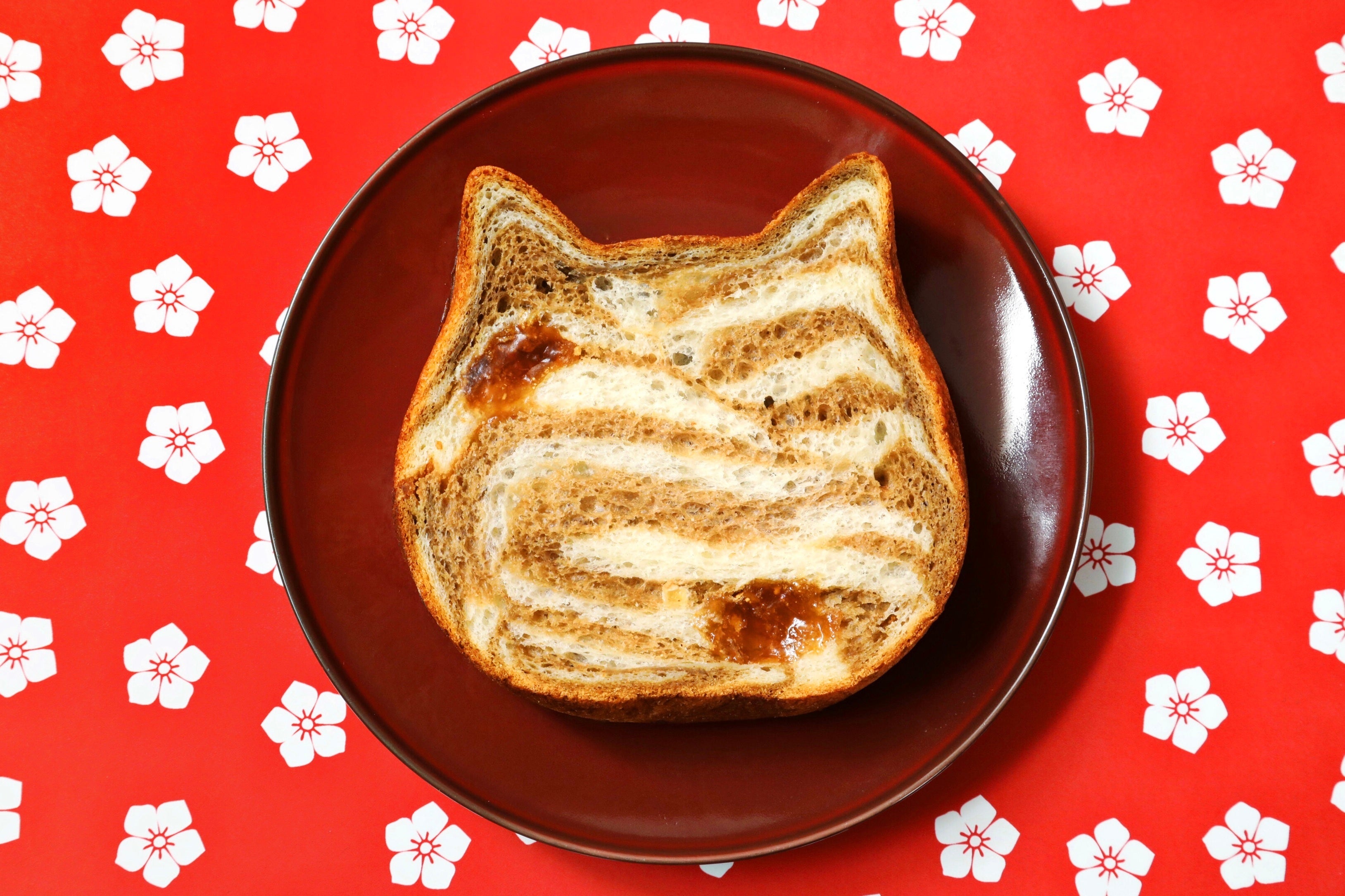 ストア限定で再登場!黒糖風味の生地とミルク100%の生地の食パンで、茶トラ柄に仕上げ