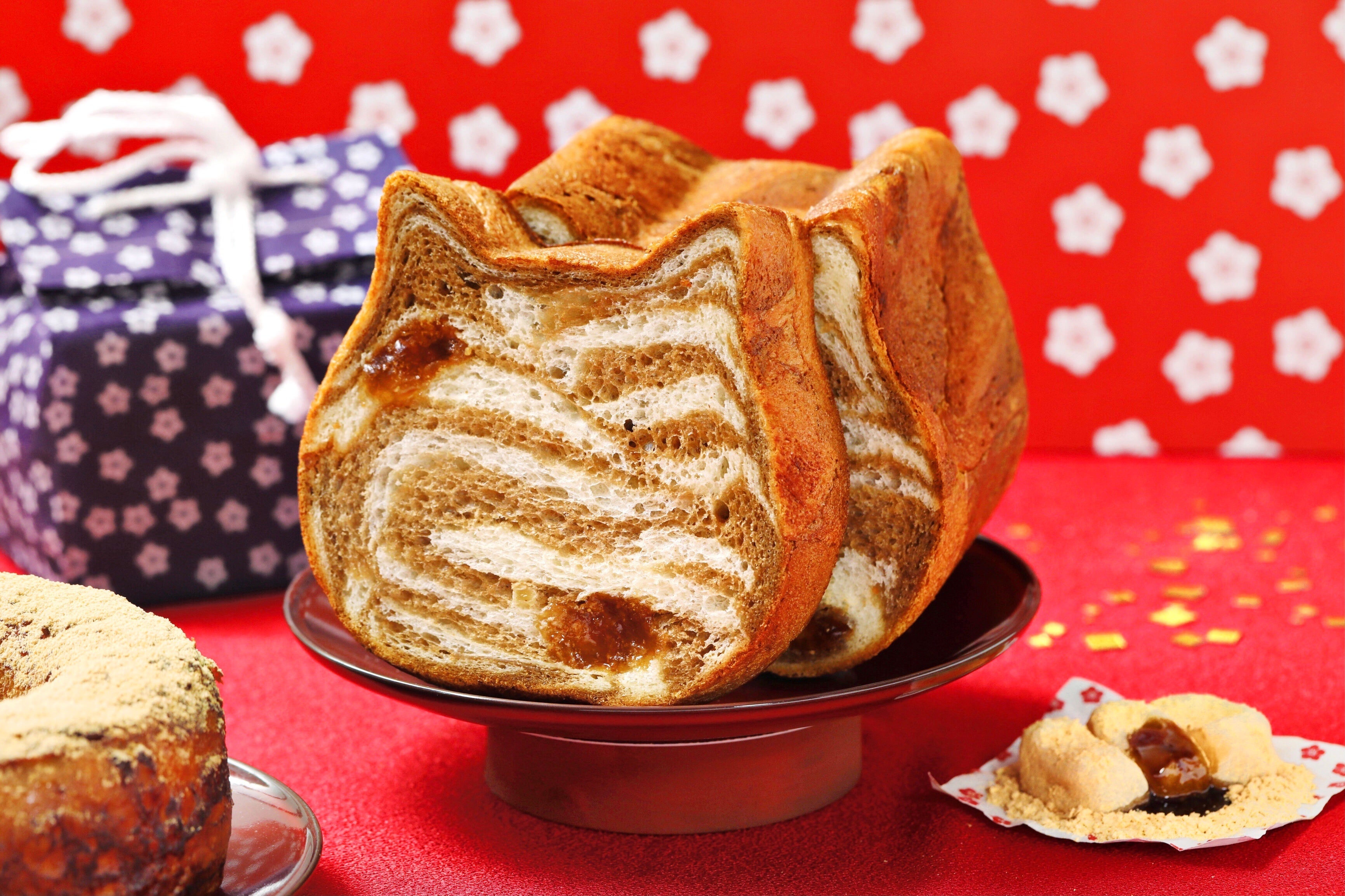 「ねこねこ」からも「桔梗信玄餅」とのコラボフレーバーが登場。過去に過去3万個※2を販売した人気商品『ねこねこ食パン 桔梗信玄餅』を公式オンラインストアにて再販売いたします。黒糖風味の生地とミルク100%の生地の食パンで、可愛らしい茶トラ柄に仕上げました。わらび餅のもちもちとした食感と、黒糖ときな粉の優しい甘みをお楽しみいただけます。