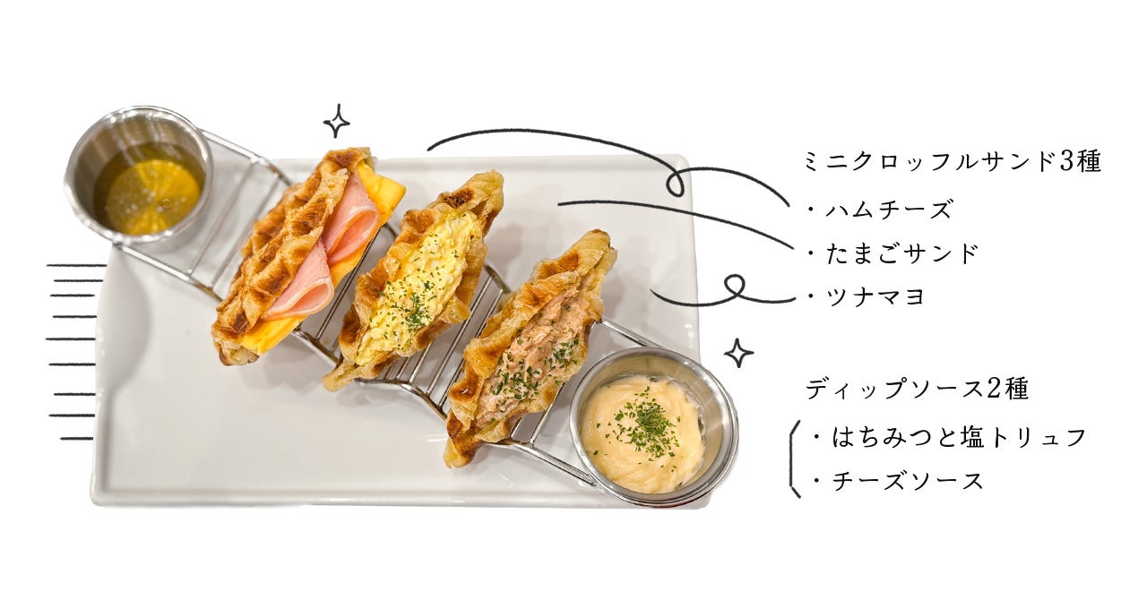 人気のクロッフルサンドをミニサイズでご用意。ハムチーズ・ツナマヨ・たまごサンドの3種類を一度に味わえるセットとなっております。さらに、ディップソースは2種類をご用意。はちみつと塩トリュフのソースは甘じょっぱい味わいを楽しめ、濃厚なチーズソースはクロッフルとの相性も抜群。味の変化を楽しみながらお召し上がりいただけます。
