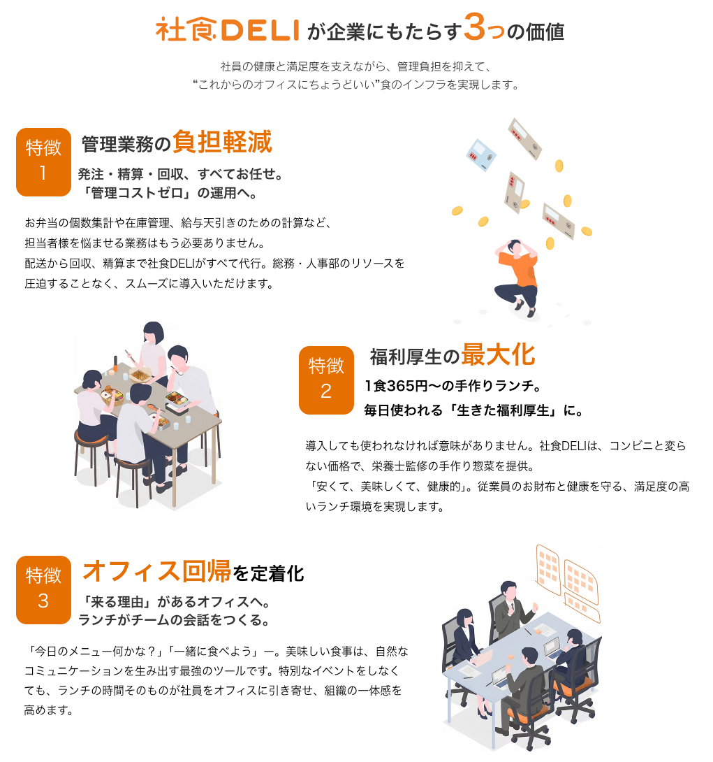 今回のリニューアルでは、社員の健康と満足度を支えつつ管理負担を抑える、“これからのオフィスにちょうどいい”食のインフラとして、「社食DELI」が企業様にもたらす「3つの価値」をよりわかりやすく明文化いたしました。