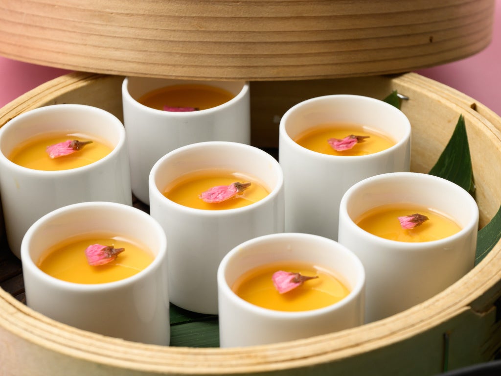 【和食料理】桜の塩漬け入りの桜餡をかけたホテル自家製のなめらかな茶碗蒸し、筍とたらの芽やふきのとうなどの短い春の山菜をサクッと揚げた天ぷらをご用意。山菜の苦味と日本酒の旨味がマッチします。