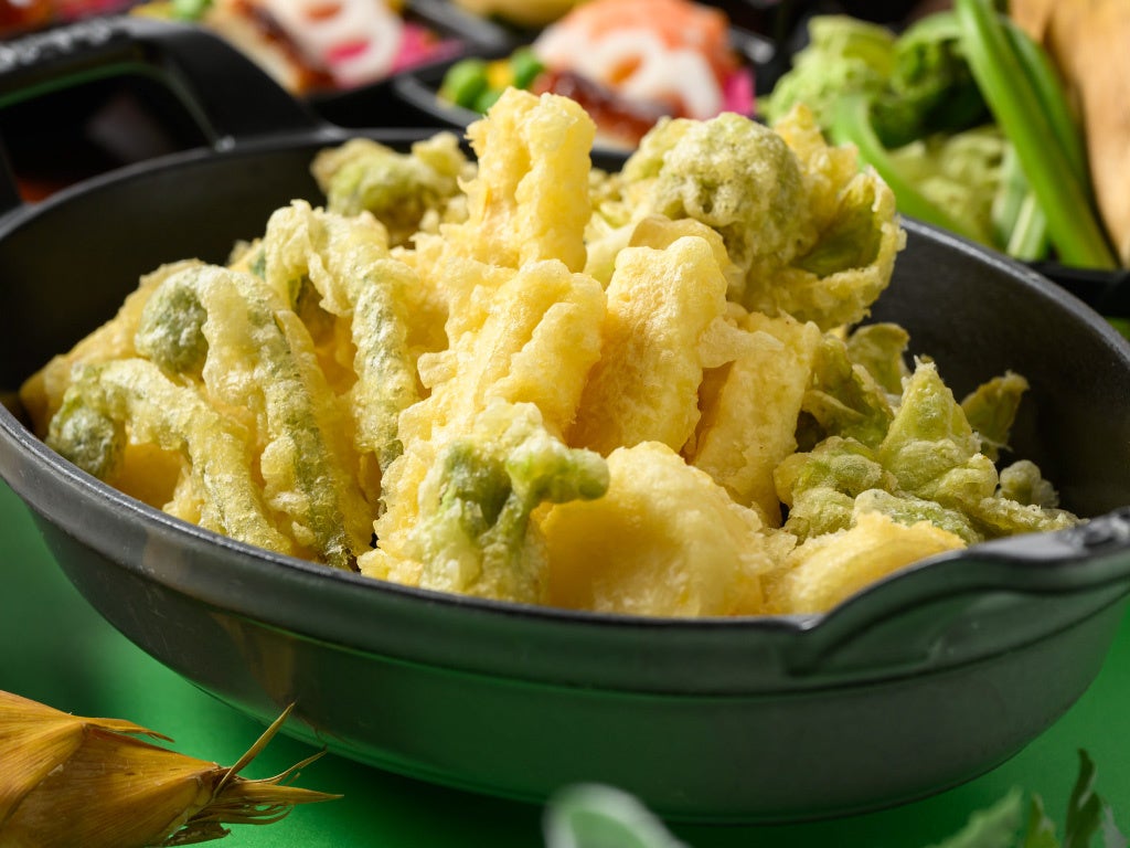 揚げ物:新じゃがと揚げ餅のアンチョビガーリック、筍と山菜の天ぷら※3・4月限定