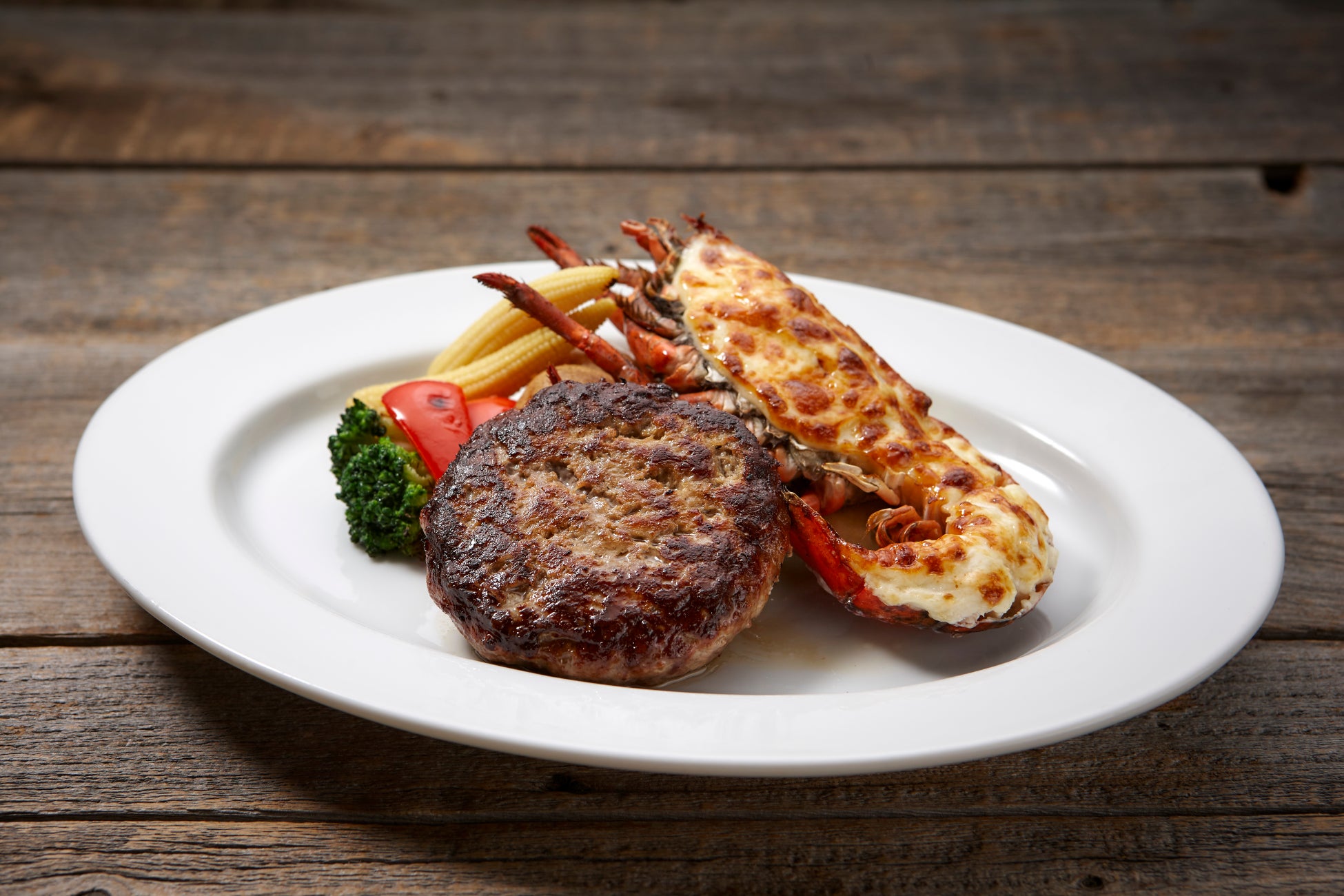 カナダ産最高級ロブスターの半身を特製マヨネーズでふっくらと焼き上げました。ジューシーな肉汁にきめ細やかで柔らかな食感のハンバーグを楽しめる贅沢な組み合わせです。