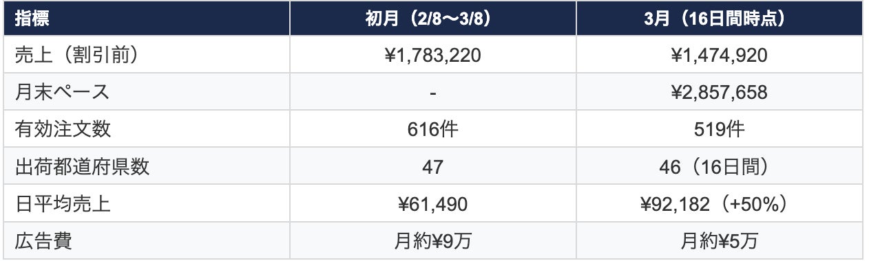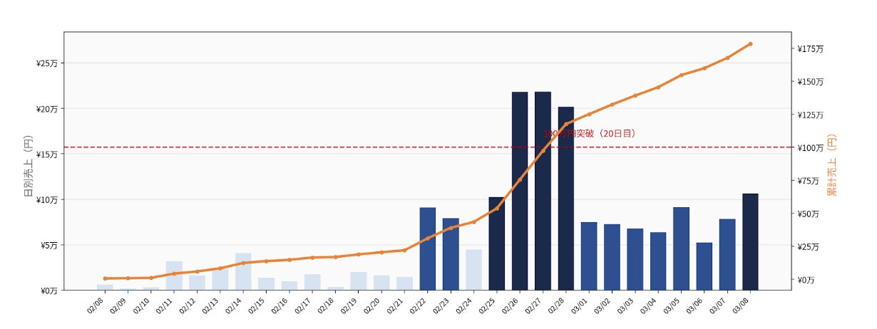 2026年2月8日に初投稿。わずか20日で累計売上100万円を突破し、初月(29日間)で178万円、全国47都道府県への出荷を達成しました