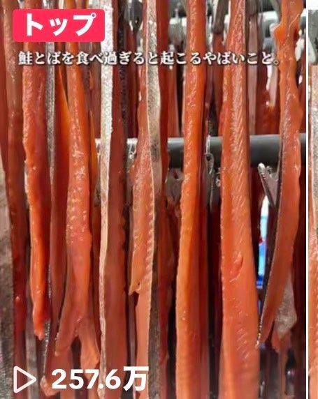 鮭とばの艶やかな赤色や裂いた瞬間の繊維感など「シズル感」のある映像で視覚的に食欲を刺激。257.6万回再生を記録した動画は、工場で鮭とばが作られる現場を映したもので、「誰が、どこで、どう作っているのか」が見えることで商品への信頼を生み出しました。天然のナラ材で燻製する本物の製法も、消費者の心をつかんでいます。