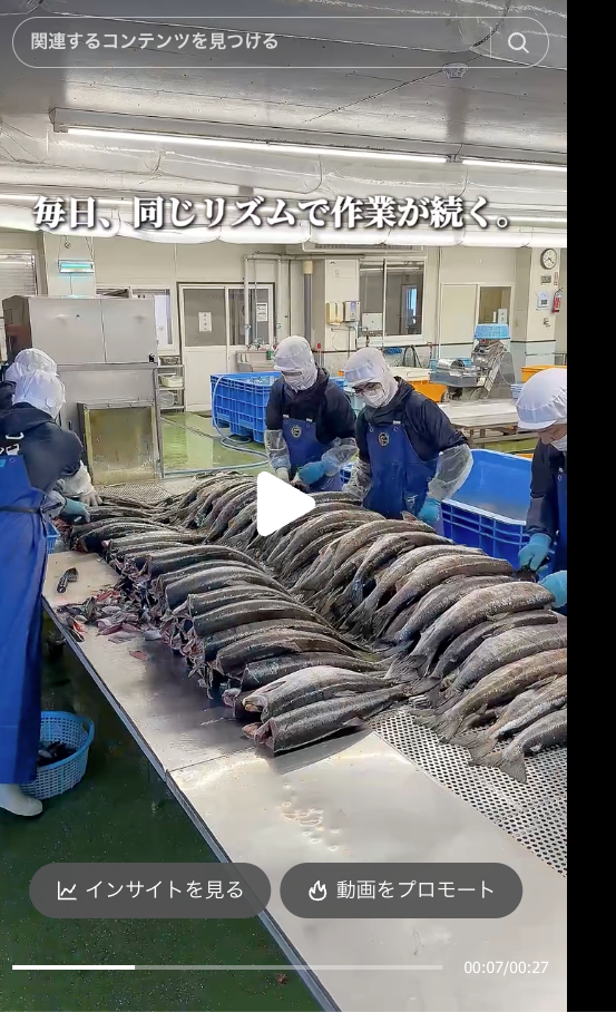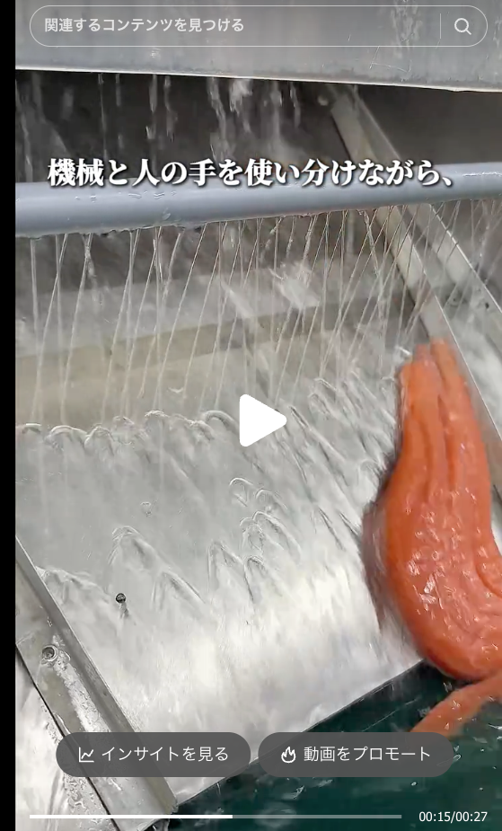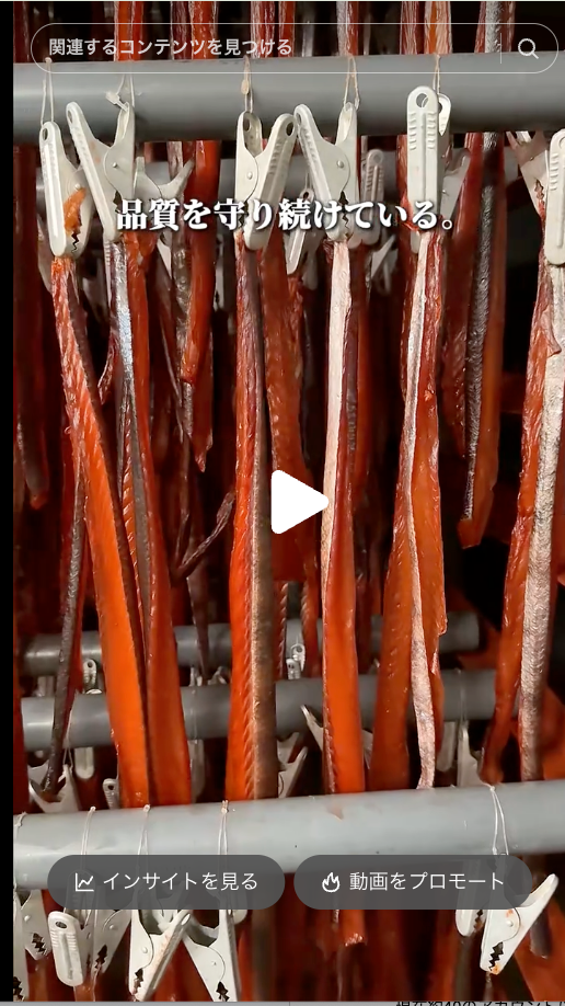 鮭とばの艶やかな赤色や裂いた瞬間の繊維感など「シズル感」のある映像で視覚的に食欲を刺激。257.6万回再生を記録した動画は、工場で鮭とばが作られる現場を映したもので、「誰が、どこで、どう作っているのか」が見えることで商品への信頼を生み出しました。天然のナラ材で燻製する本物の製法も、消費者の心をつかんでいます。