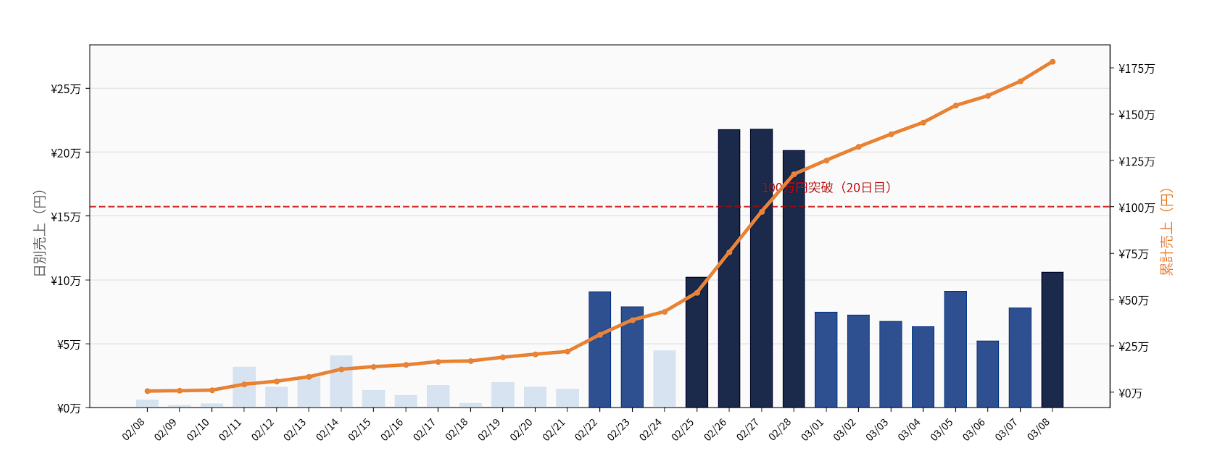 2026年2月8日に初投稿。わずか20日で累計売上100万円を突破し、初月(29日間)で178万円、全国47都道府県への出荷を達成しました