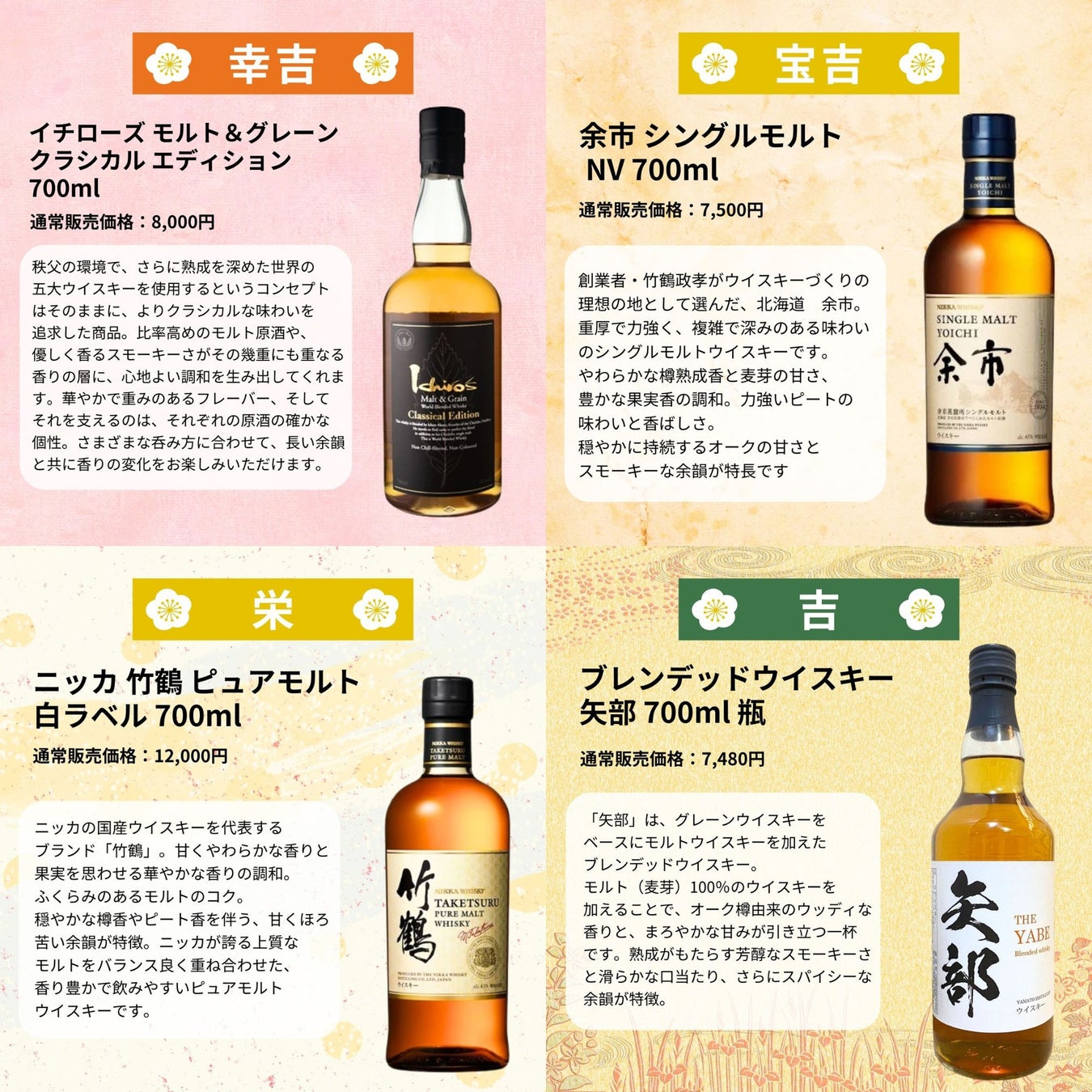 今回の超大吉には、入手困難な最高峰《山崎18年》を採用。 さらに白州18年、山崎シングルモルト、白州シングルモルト、響ジャパニーズハーモニー、イチローズモルトなど、国内外で高い評価を受ける銘柄を封入した、特別仕様の第5弾です。