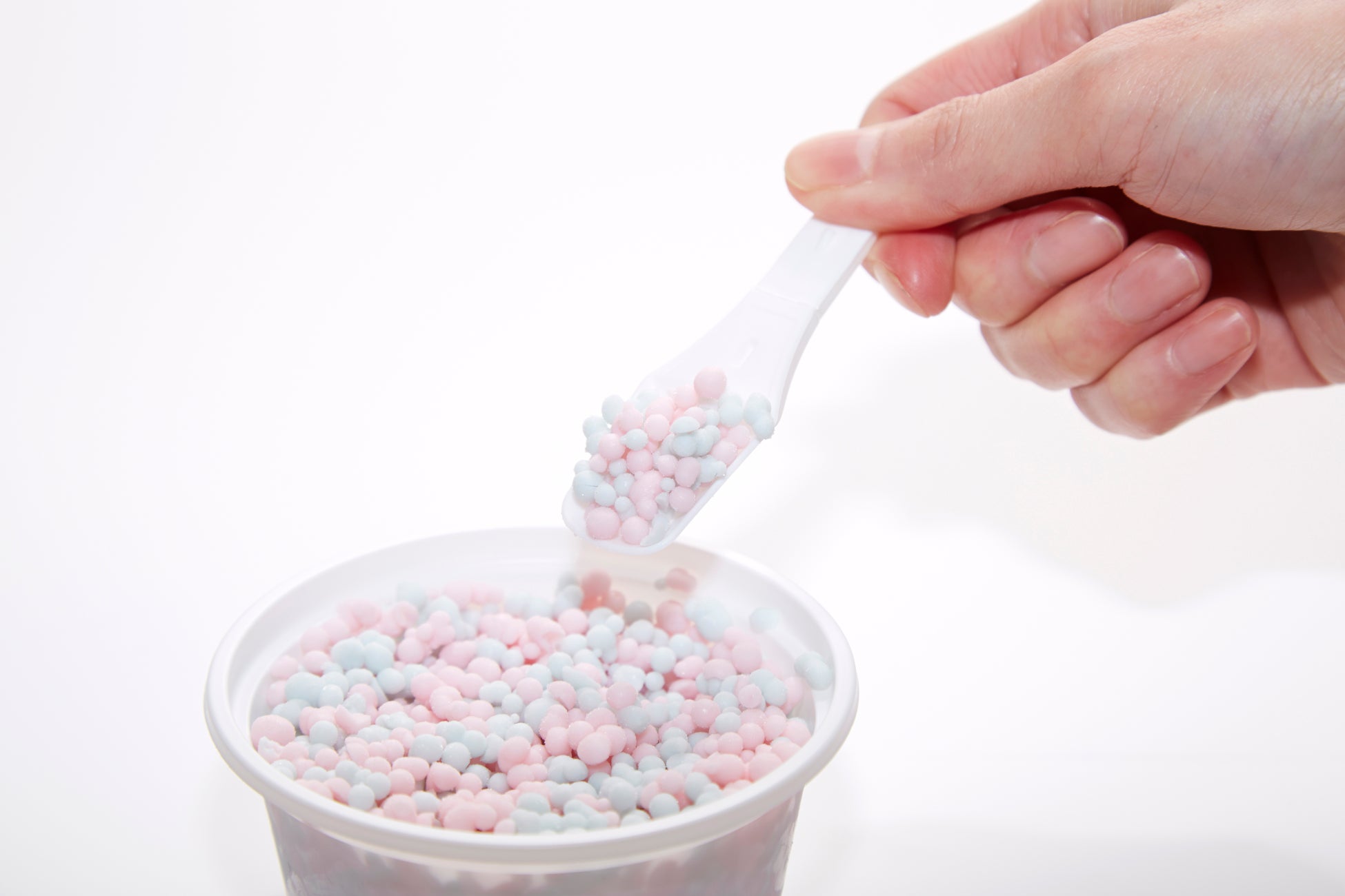 従来の粒状アイスは溶けやすく、マイナス40℃以下での保存が必要とされていましたが、長年の研究開発により、家庭用冷凍庫(マイナス18℃以下)での保存を可能にしました。