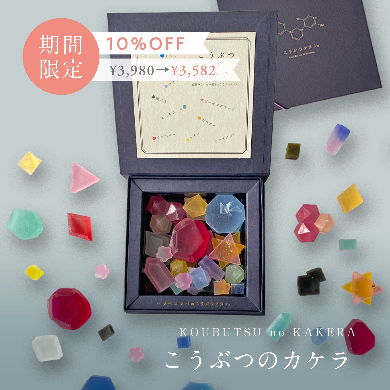 春は、卒業や送別、新生活のスタートなど、「ありがとう」を伝える機会が最も増える季節です。ハラペコラボが手がける、宝石や鉱物のような琥珀糖「こうぶつヲカシ」は、“まるで宝石を食べるような体験”ができる特別なお菓子として、大切な方への贈り物に選ばれてきました。受け取った瞬間に心が弾む、その特別なひとときを思い描きながら、ひとつひとつ丁寧に制作しています。本キャンペーンでは、ギフトシーズンにあわせた特別価格での提供に加え、次回のお買い物にご利用いただけるクーポンをご用意。母の日や父の日など、次の「ありがとう」へとつながるきっかけをお届けします。ハラペコラボは、「ありがとう」を気軽に、そして美しく伝えられるギフトとして、「こうぶつヲカシ」を通じた新しいセレモニー体験を提案します。