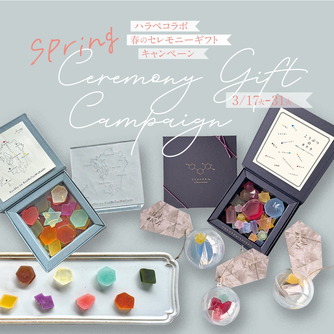 春は、卒業や送別、新生活のスタートなど、「ありがとう」を伝える機会が最も増える季節です。ハラペコラボが手がける、宝石や鉱物のような琥珀糖「こうぶつヲカシ」は、“まるで宝石を食べるような体験”ができる特別なお菓子として、大切な方への贈り物に選ばれてきました。受け取った瞬間に心が弾む、その特別なひとときを思い描きながら、ひとつひとつ丁寧に制作しています。本キャンペーンでは、ギフトシーズンにあわせた特別価格での提供に加え、次回のお買い物にご利用いただけるクーポンをご用意。母の日や父の日など、次の「ありがとう」へとつながるきっかけをお届けします。ハラペコラボは、「ありがとう」を気軽に、そして美しく伝えられるギフトとして、「こうぶつヲカシ」を通じた新しいセレモニー体験を提案します。
