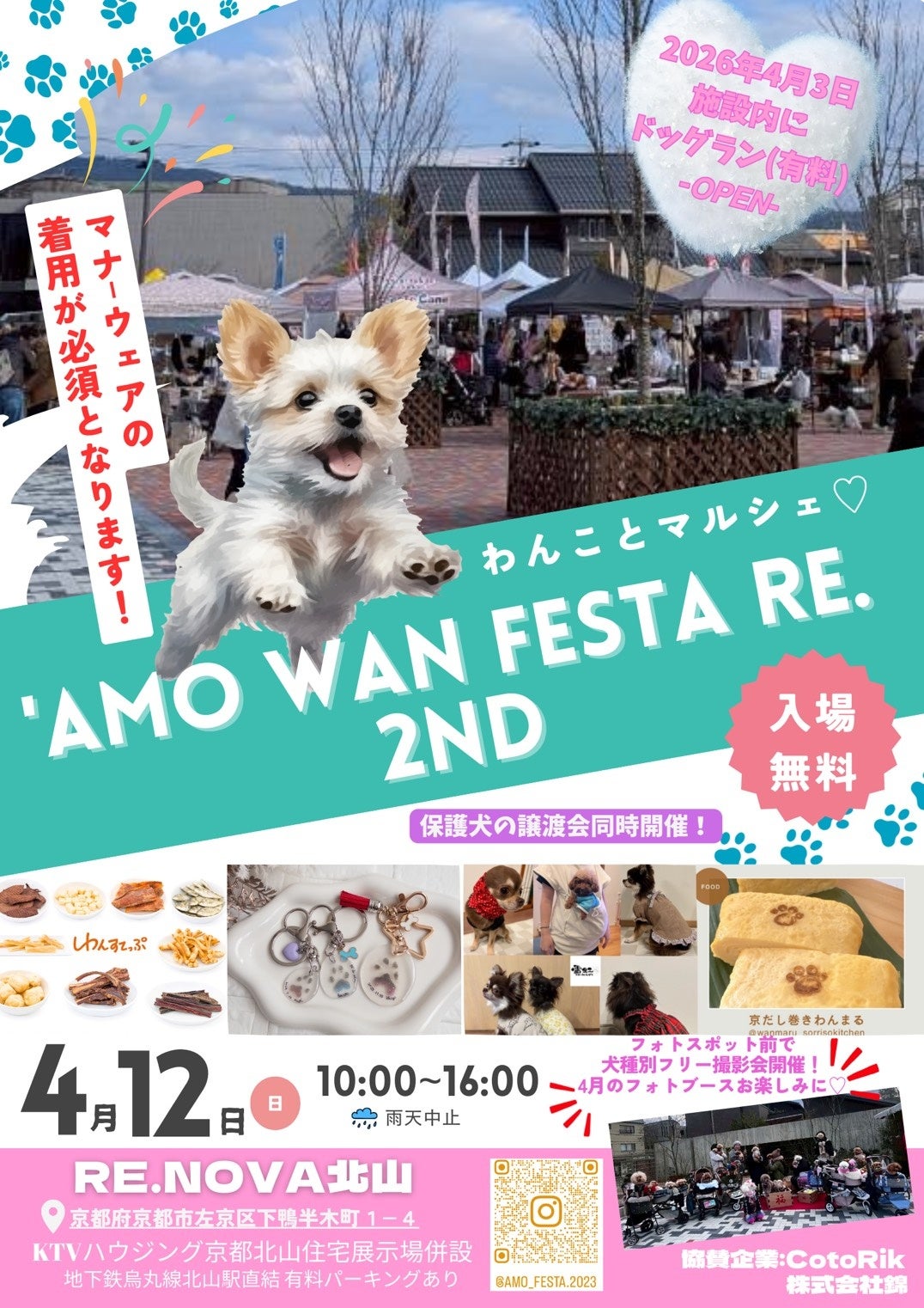 4月12日(日)には、『’AMO WAN FESTA RE.』が開催。春の心地よい気候の中、ワンちゃんと楽しめるマルシェイベントにぜひお越しください。