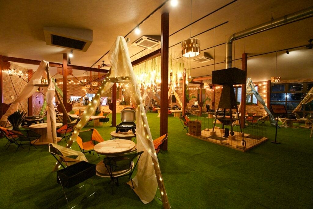 一面人工芝を敷き詰めた開放的なリゾート空間と、煌びやかな照明のおしゃれな空間で楽しむバーベキューは、女子会やデートに最適です。