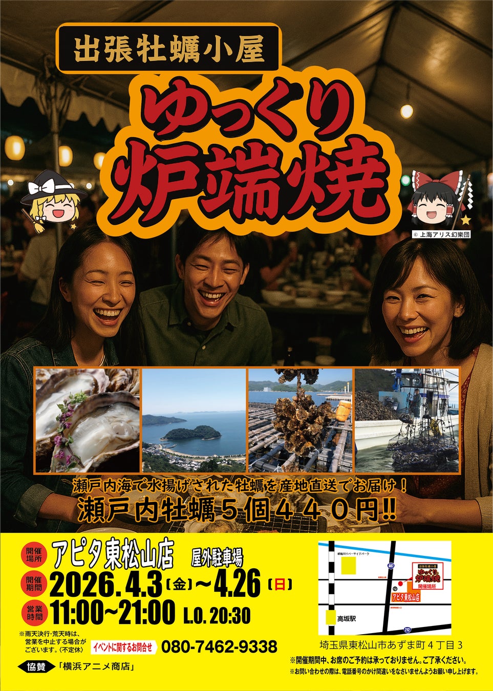 瀬戸内産牡蠣、 赤穂産牡蠣、 石巻産牡蠣など各地で水揚げされた牡蠣を産地直送でお届け‼ ゆっくり炉端焼き実行委員会 (080-7462-9338) 4月3日、 アピタ東松山店 屋外駐車場 特設会場 (埼玉県東松山市) にて期間限定オープン。 開催期間は、 4月3日 (金) から4月26日 (日)