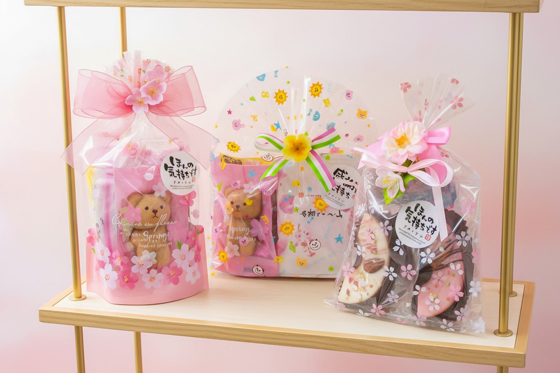 ラッピングの中には、つぶらな瞳がたまらない「クマさんのフィナンシェ」や「ピンク色の春色バウム」など、春爛漫の“盛りビジュアル”のお菓子たちばかり♪