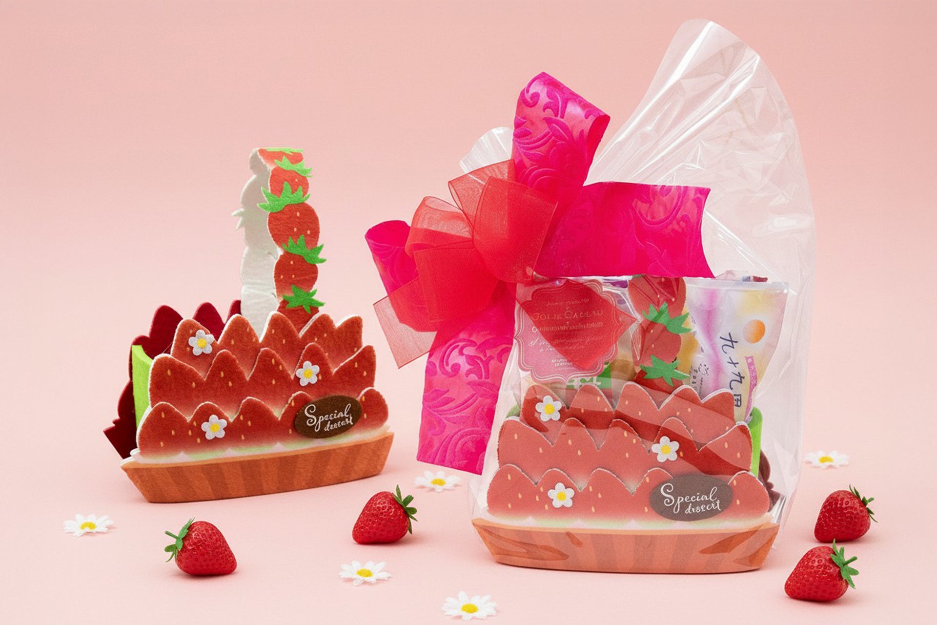 包みを開ける前は、華やかなローズピンクの大きなリボンが目を惹く、少し大人っぽくシックな装い。でも、中から現れるのは…あまりの可愛さにびっくりする「本物そっくりの苺タルト」!