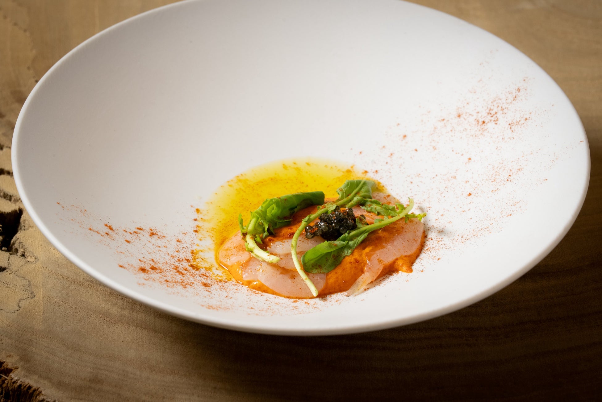 パプリカムースを美味しく召し上がっていただくために、富山白エビと合わせました。小江戸キャビアの塩味が程よく感じられる一品です。