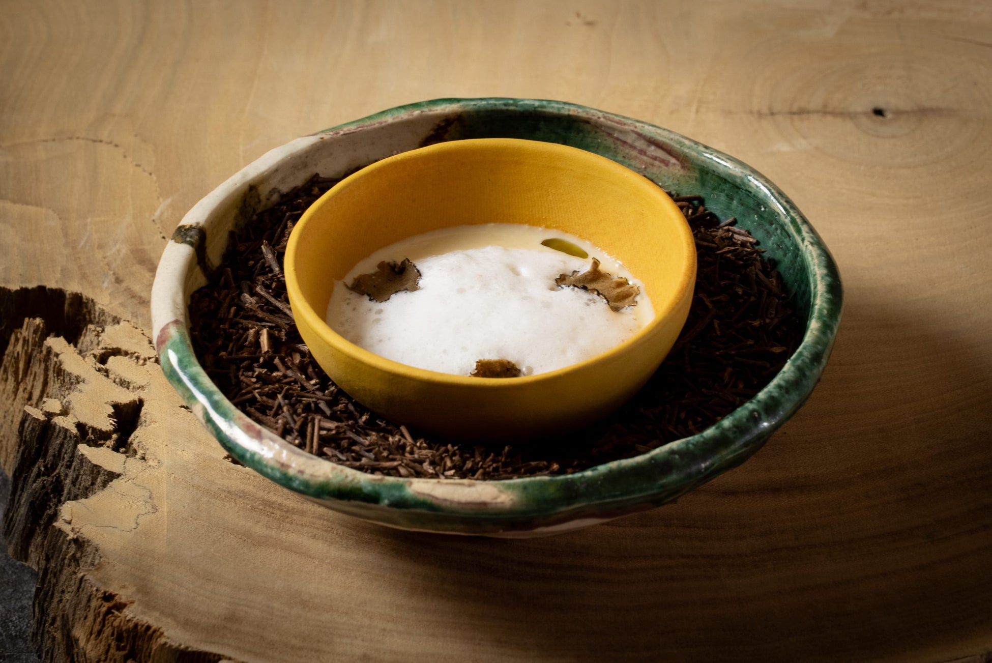 ほうじ茶の香りを移した、とうもろこしの冷製ポタージュです。スライストリュフと一緒にお召し上がりください。