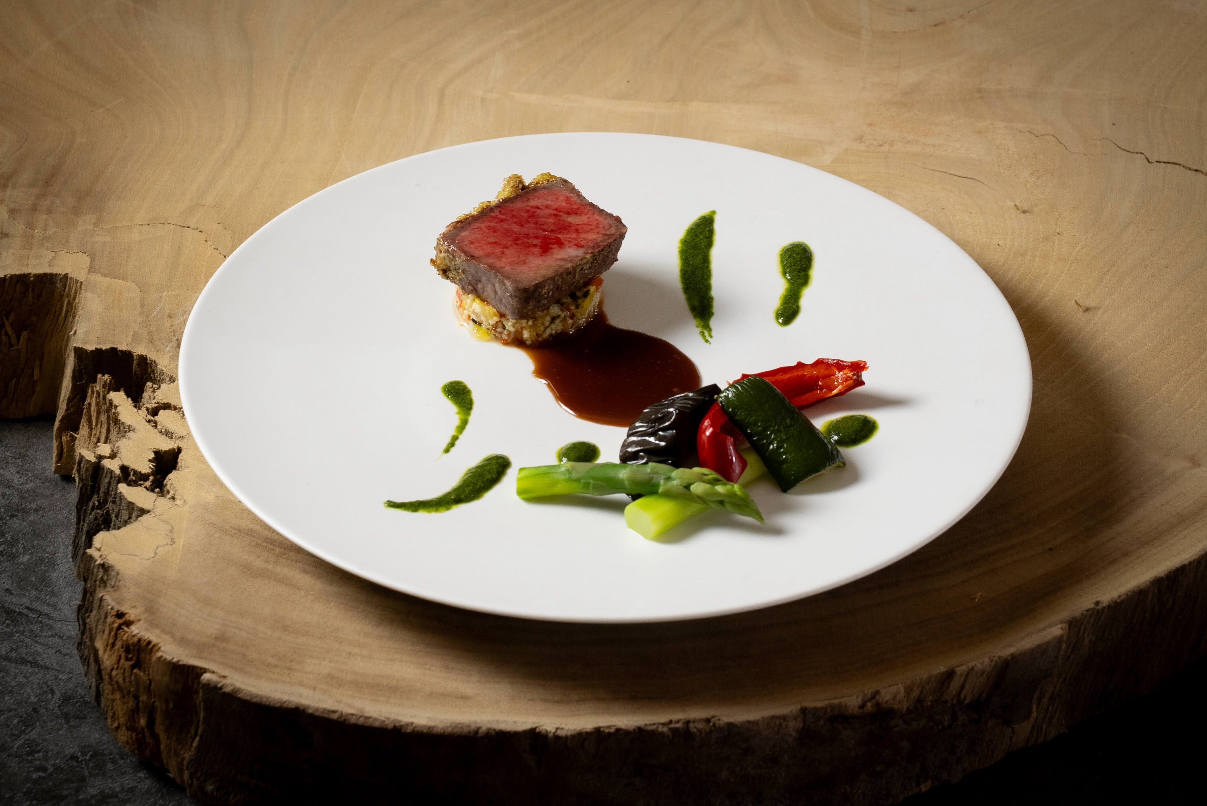 南仏をイメージした一皿。フレンチの定番料理をモダンに仕上げました。脂身が程よく入った深谷牛のランプ肉を使用しています。