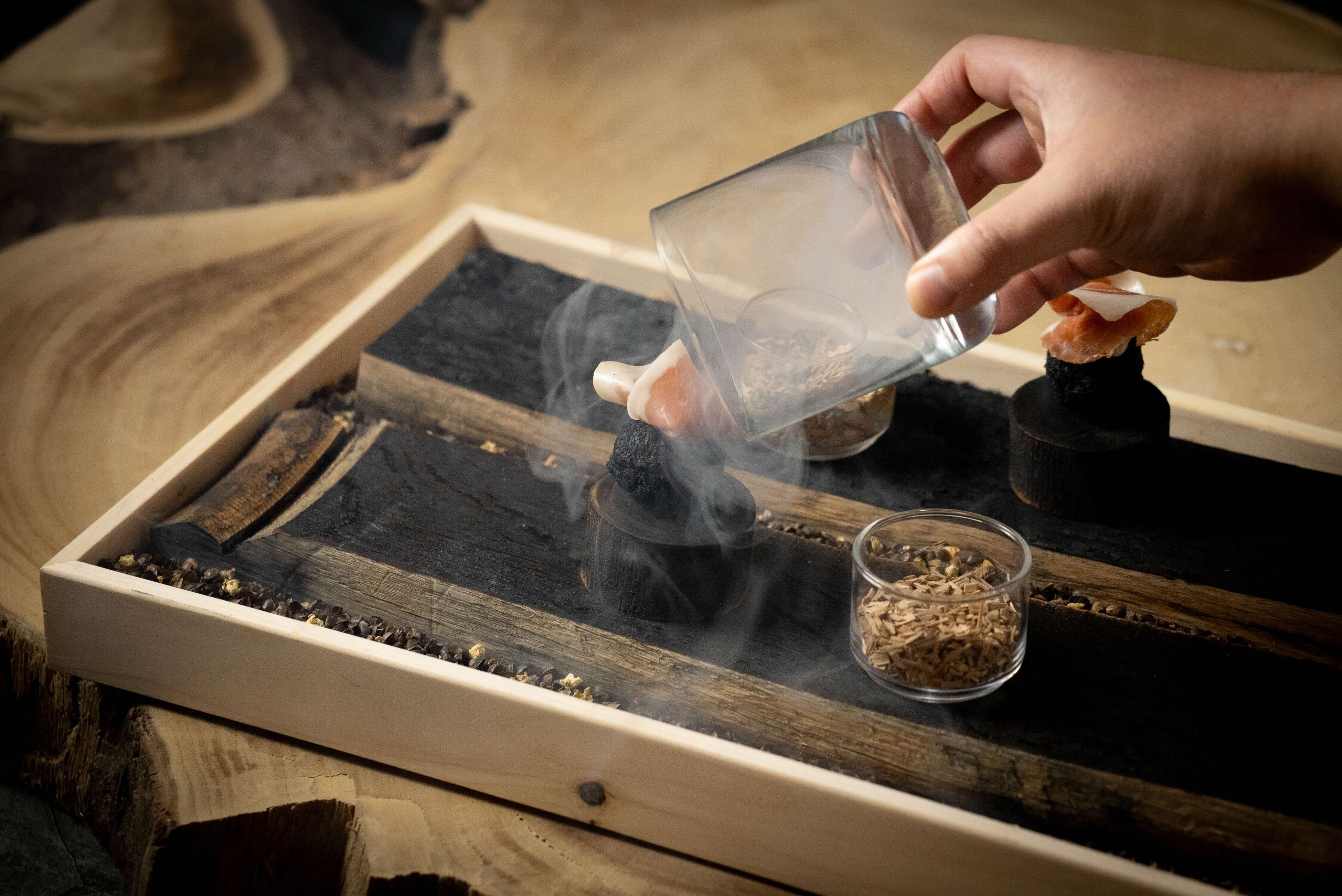 地元のお野菜のコロッケでおもてなし。季節の野菜コロッケの上に「坂戸セラーノ」の生ハムをのせ、秩父のスモークチップで燻製させています。