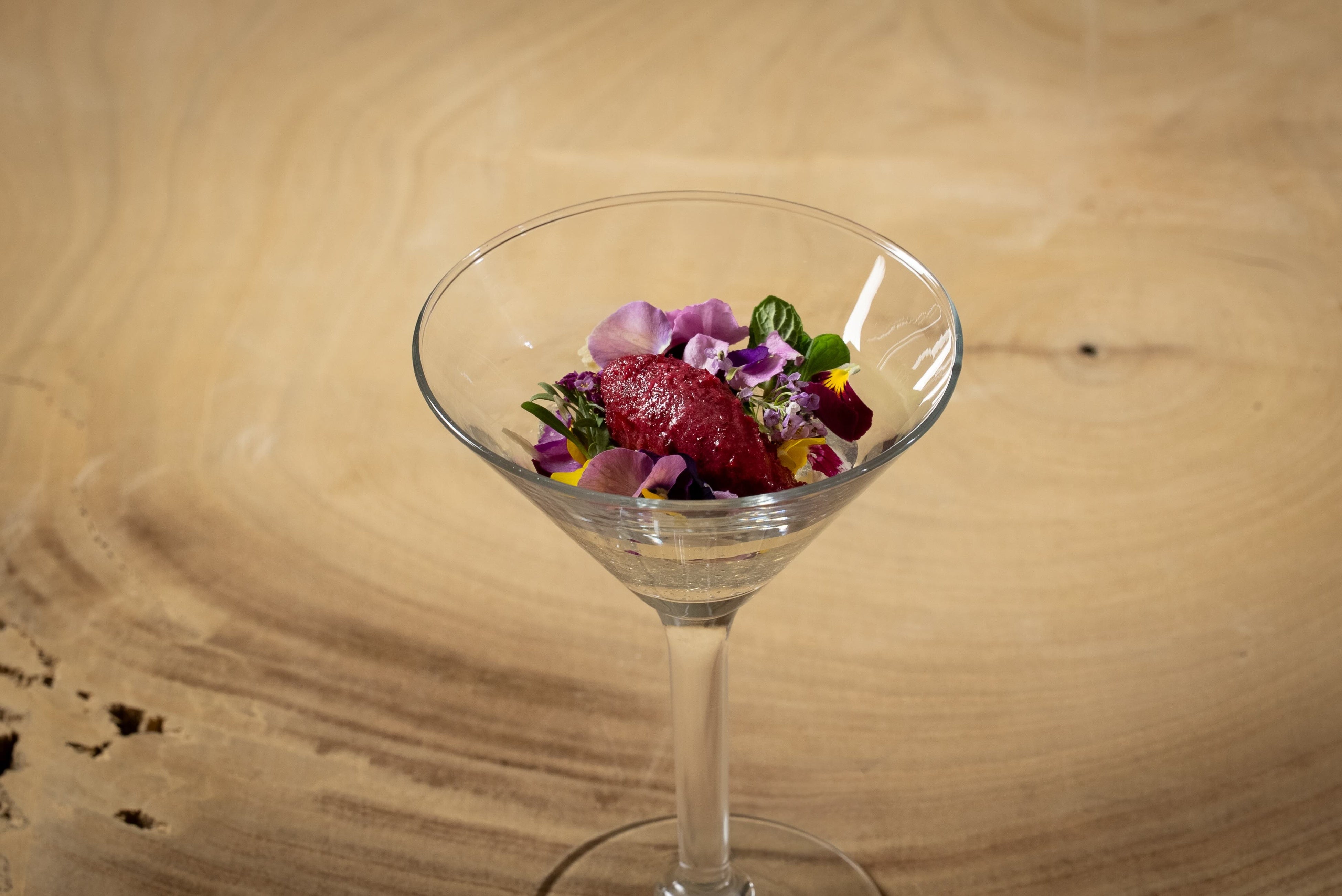 苺を贅沢に使用し、濃厚なソルベに仕上げました。食べられるお花とお花のジュレとともにお召し上がりください。