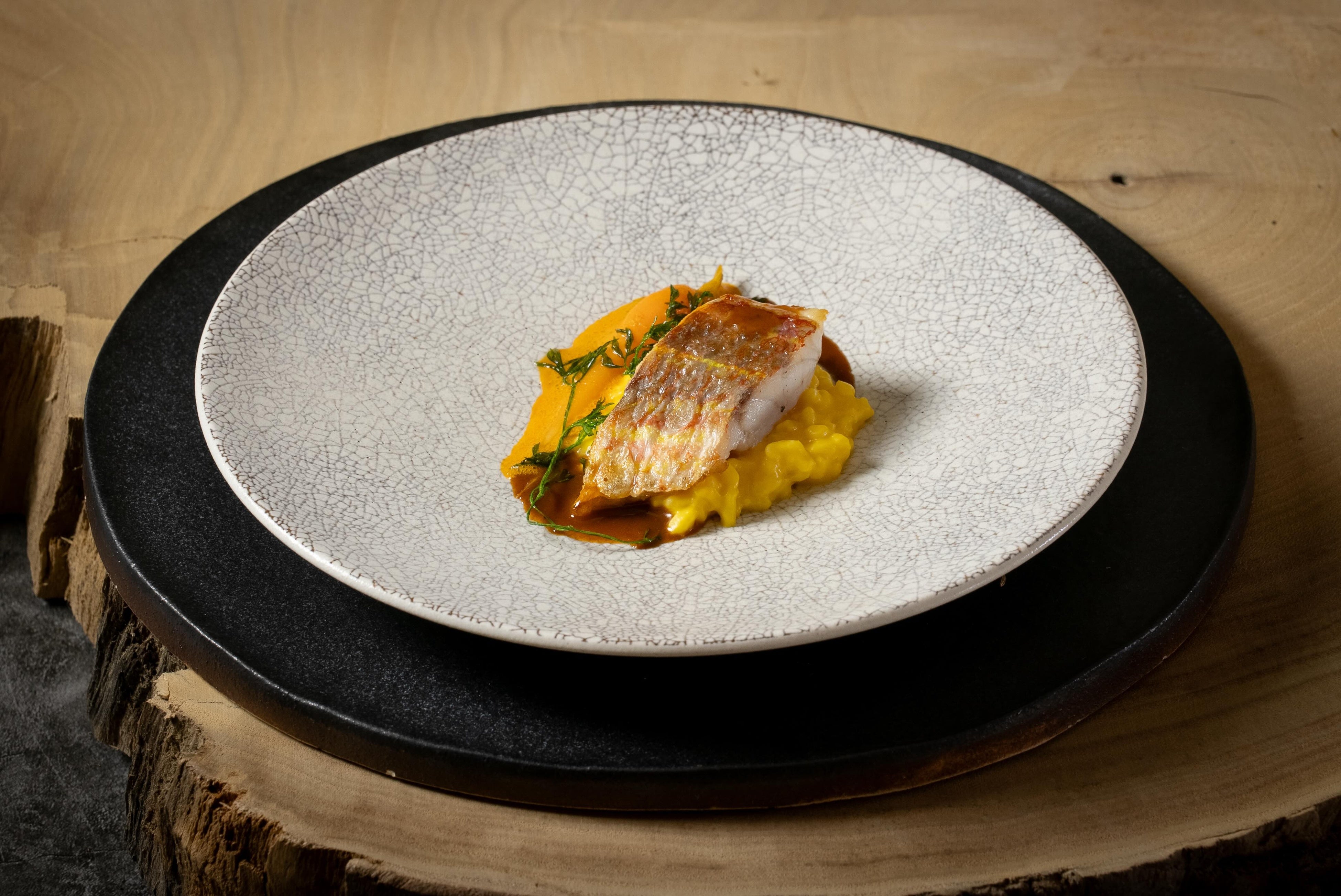 甘味のある人参リゾット、ふっくら仕上げた石垣島のハタ、甲殻類の旨みを濃縮させたアメリケーヌソースとともに。