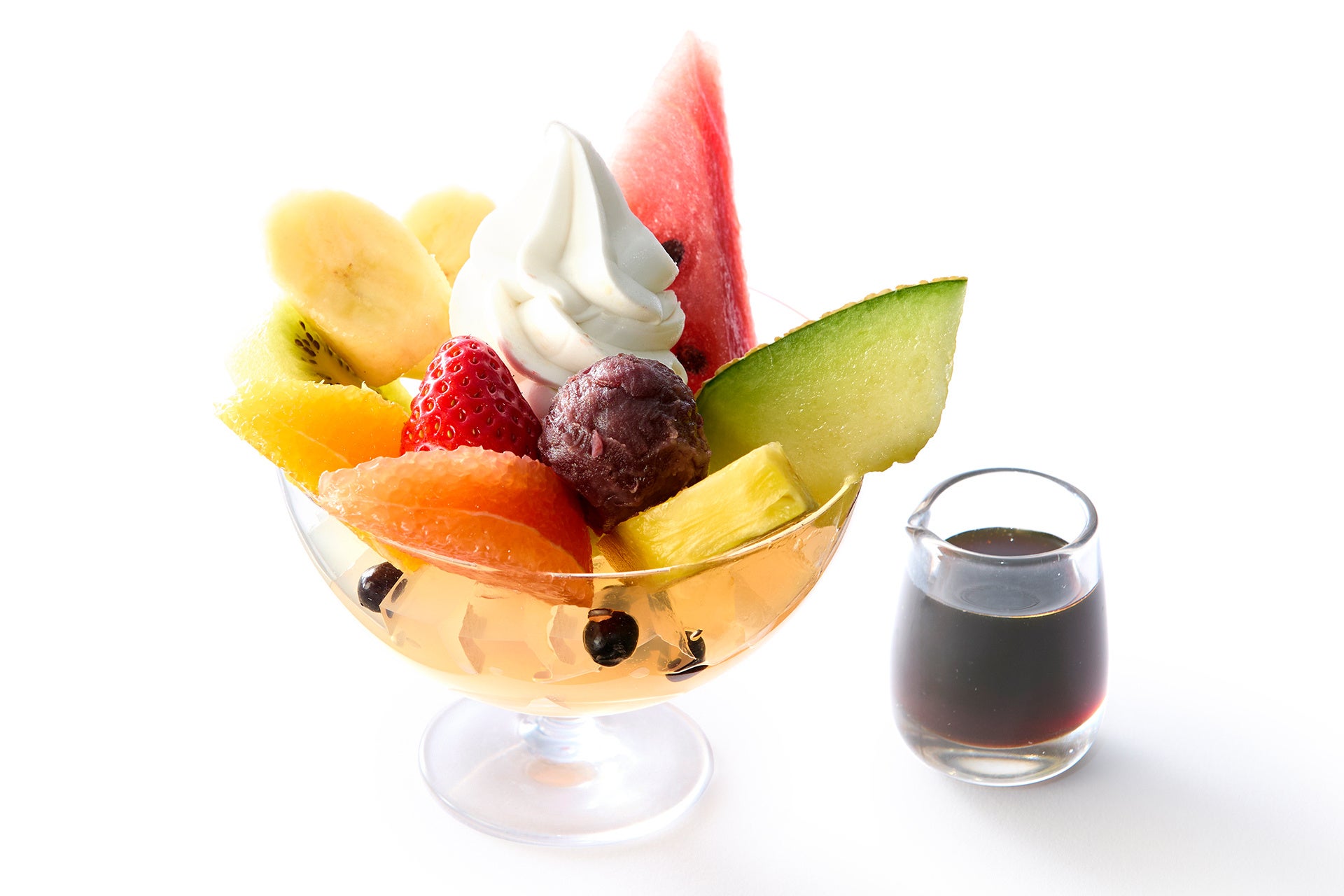 寒天、赤えんどう豆の上には8種類のフルーツと粒あん、そしてソフトクリームをトッピングしています。