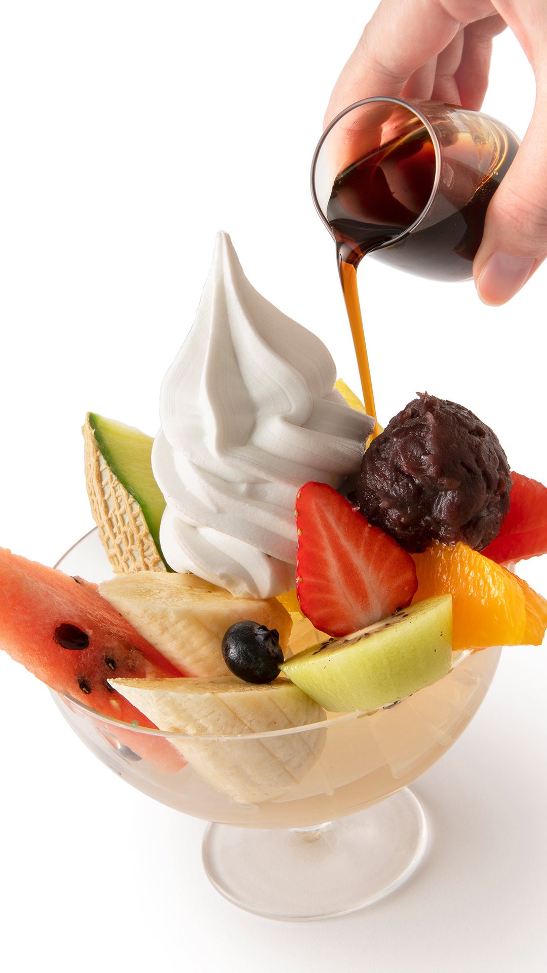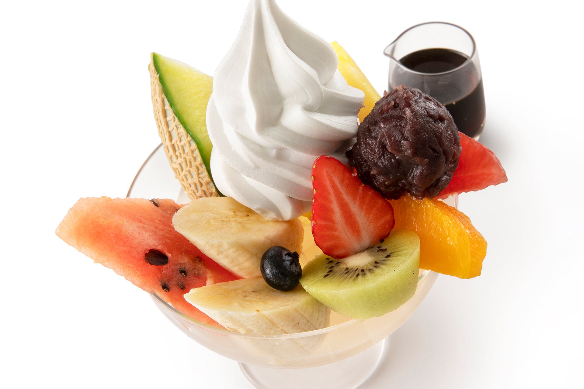 寒天、赤えんどう豆の上には8種類のフルーツと粒あん、そしてソフトクリームをトッピングしています。