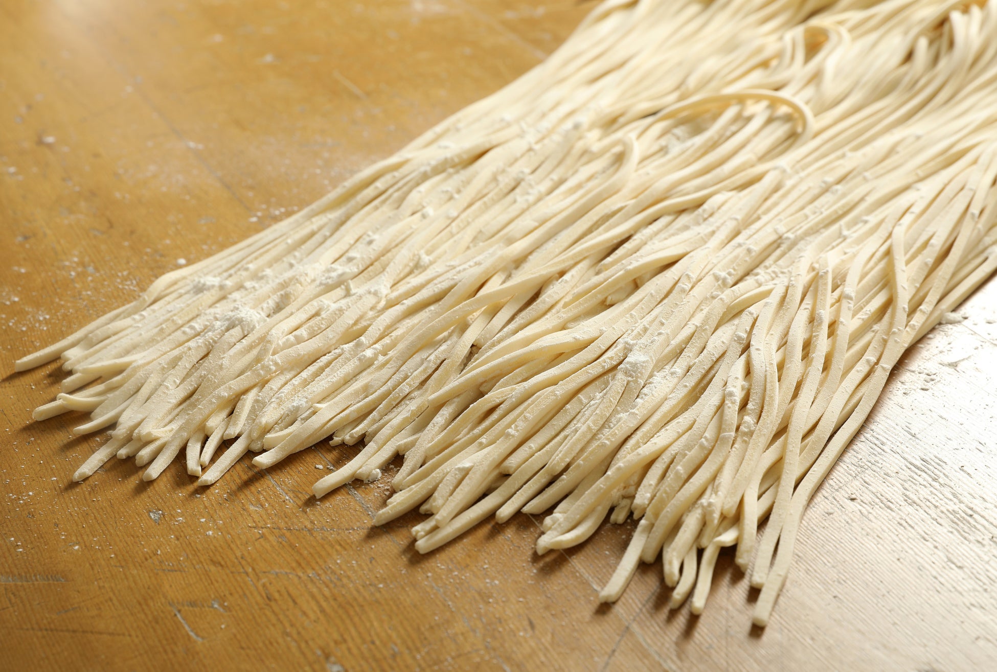 杵屋では、創業当初より、店頭で職人がうどんを打つ“実演手打”によるうどんを提供してまいりましたが、その後、全国へと店舗展開を進める中で、より多くのお客様に安定した品質のうどんをお届けするため、技術の進化を取り入れた機械製麺方法へと発展。今では実演手打によるうどんを提供しているのは高松オルネ店と京都ポルタ店など10数店舗となっています。