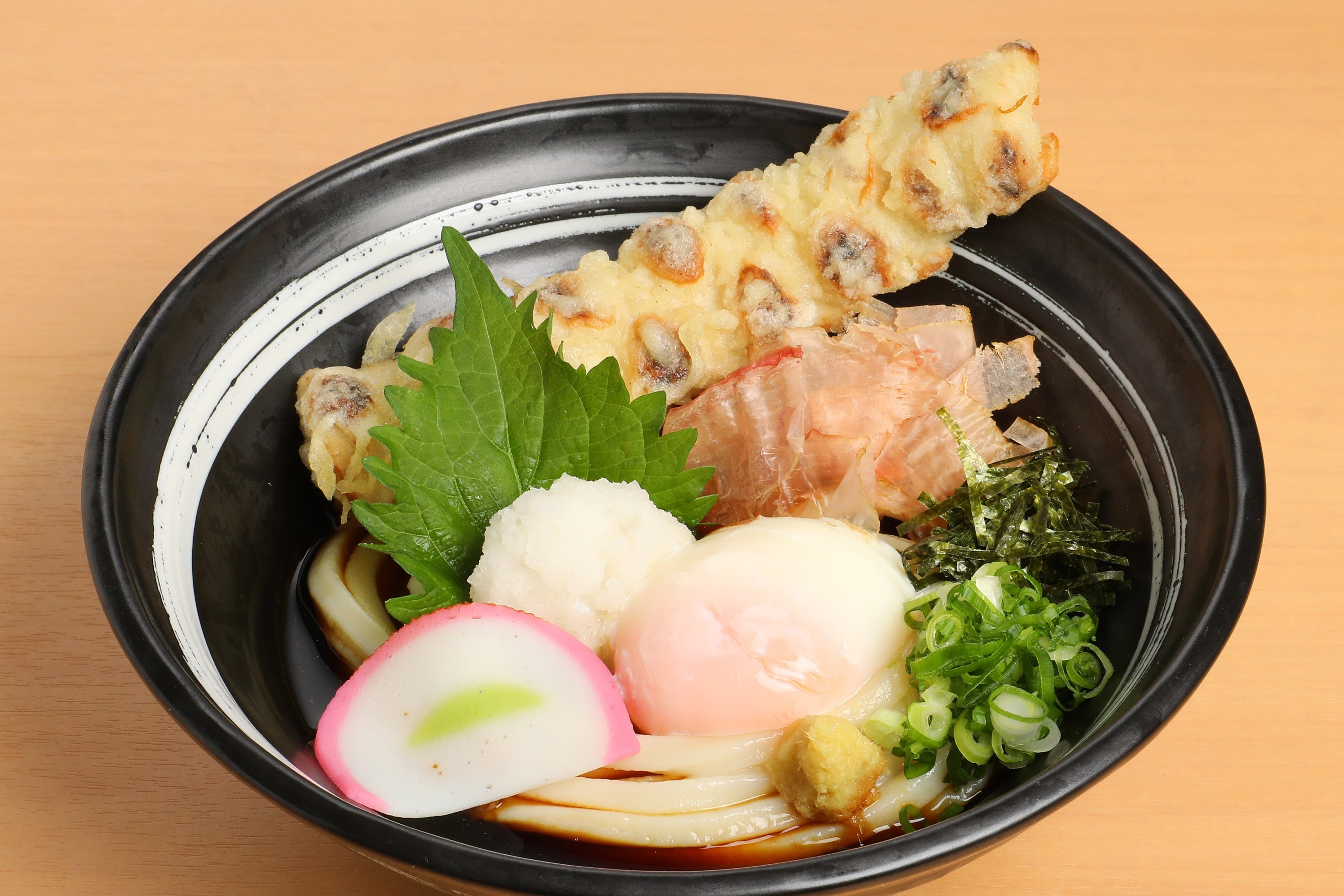 サクッと揚げたちくわ天を噛みしめると、素材の旨みがふわっと広がり、そこにとろりとした温泉玉子が絡んで、思わず箸が進む至福の味わいに仕上げました。