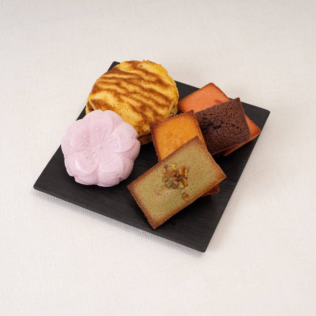 桜風味の餡と求肥餅を挟んだ最中や、蜂蜜香るしっとりとした生地に粒餡を合わせたお菓子に加え、バターの香り豊かなフィナンシェ(プレーン・ショコラ・ピスタチオ・苺)をご用意。和と洋、それぞれの魅力を一度に楽しめる贅沢な構成です。