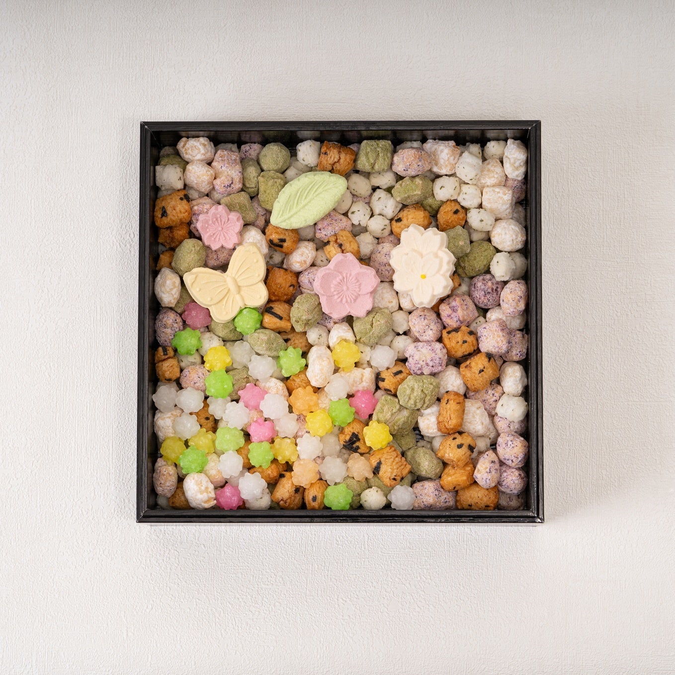 良縁を願う金平糖、運を運ぶとされる海苔付き醤油煎餅、日持ちすることから縁起が良いとされる砂糖菓子を詰め合わせました。さらに、桃色(魔除け・生命)、白(清浄・子孫繁栄)、緑(健康・長寿)の意味を持つ三色あられを散りばめ、見た目にも華やかで縁起の良い一段に仕上げています。