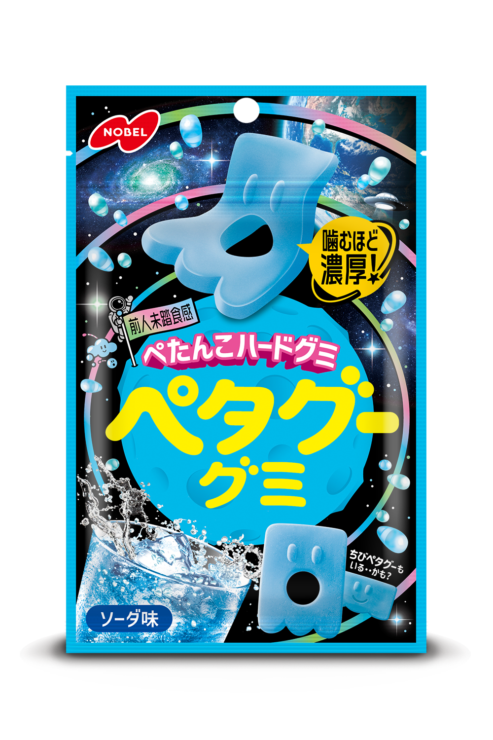 3月の「グレープ味」のリニューアルに引き続き、このたび「ソーダ味」についてもリニューアルを実施い たしました。 パッケージデザインは、先行して展開しているグレープ味と同様、「ペタグーグミ」ならではの「宇宙」の 世界観を前面に打ち出し、ペタグーらしいシュールなユーモアを楽しめるデザインに仕上げています。 また味わいについても、ソーダの甘酸っぱく爽やかな風味が噛むほどに広がり、心地よい弾力とともに最後 まで飽きずに楽しめるおいしさとなっています。