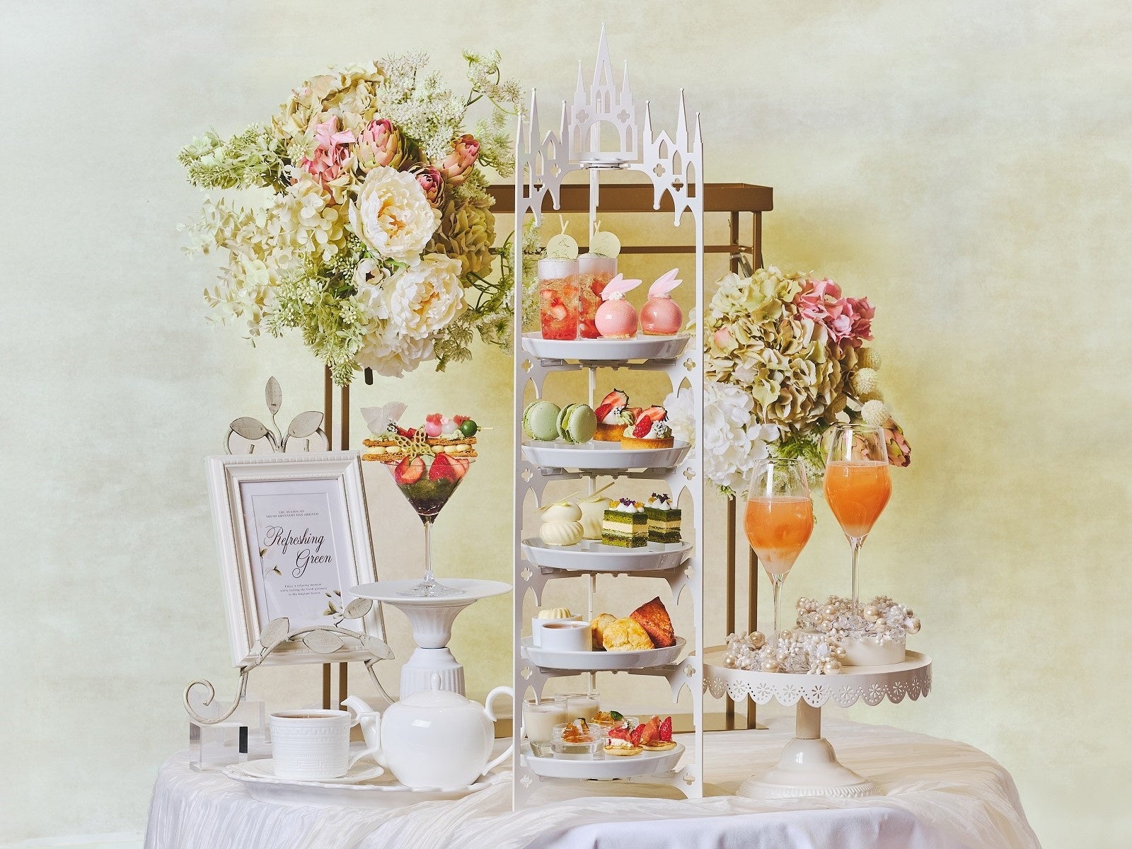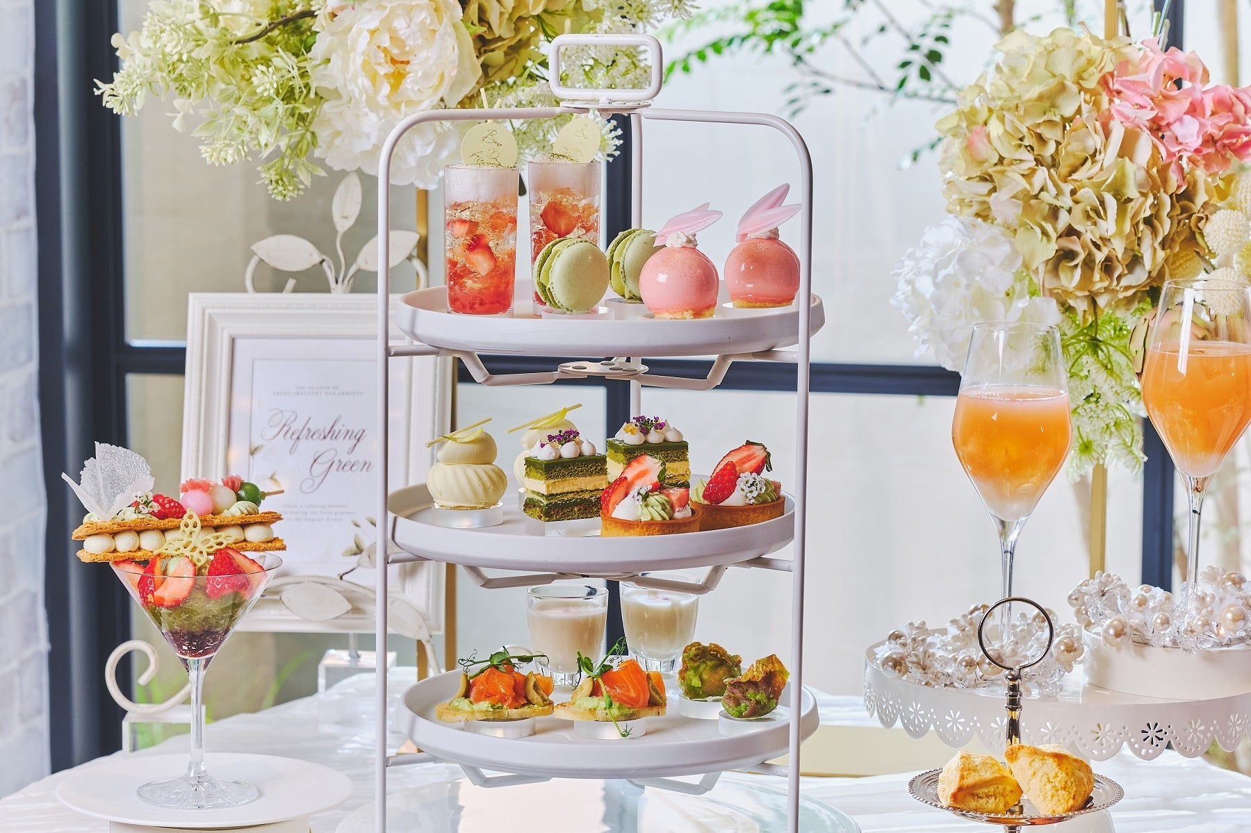 お飲み物は、スイーツとスコーンに合う紅茶やソフトドリンクを幅広くセレクトした「スタンダードプラン」、フランスの老舗紅茶ブランド「マリアージュ フレール」の紅茶やフレーバードティーを何杯でも楽しめる「ティーセレクションプラン」よりお選びいただけます。