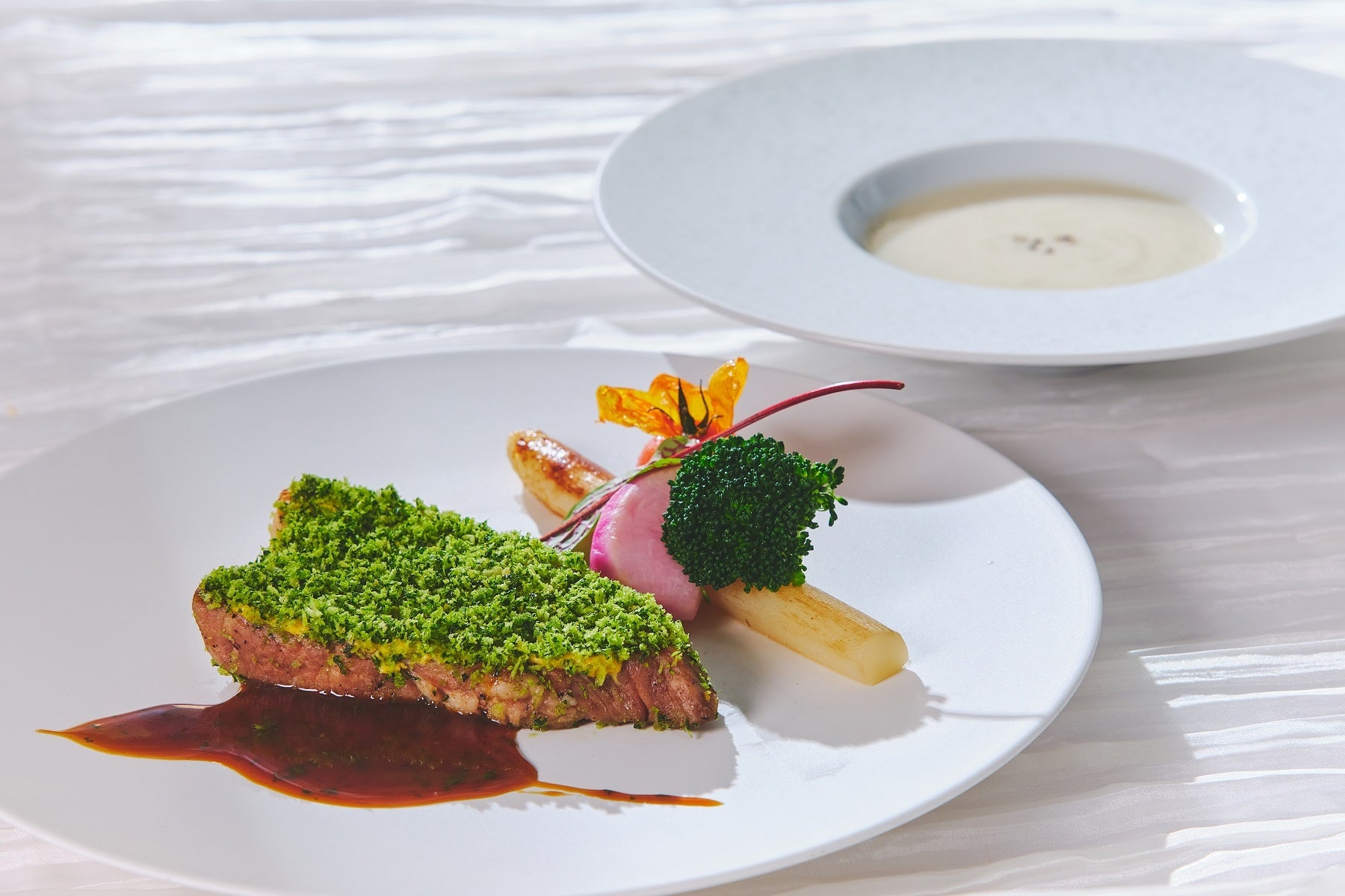 豚肩ロースの香草パン粉焼き ハーブとマスタードのソース/サルシフィーのポタージュ 1,500円