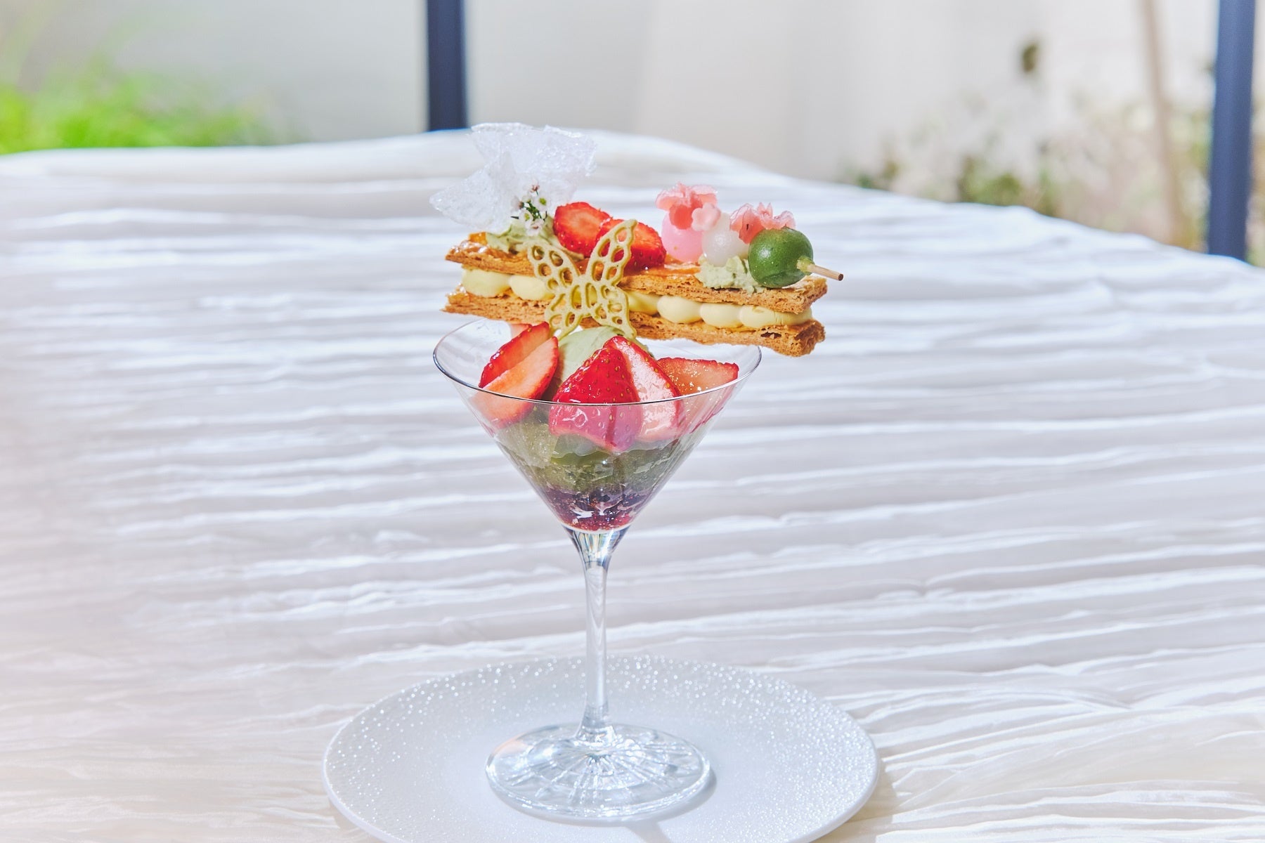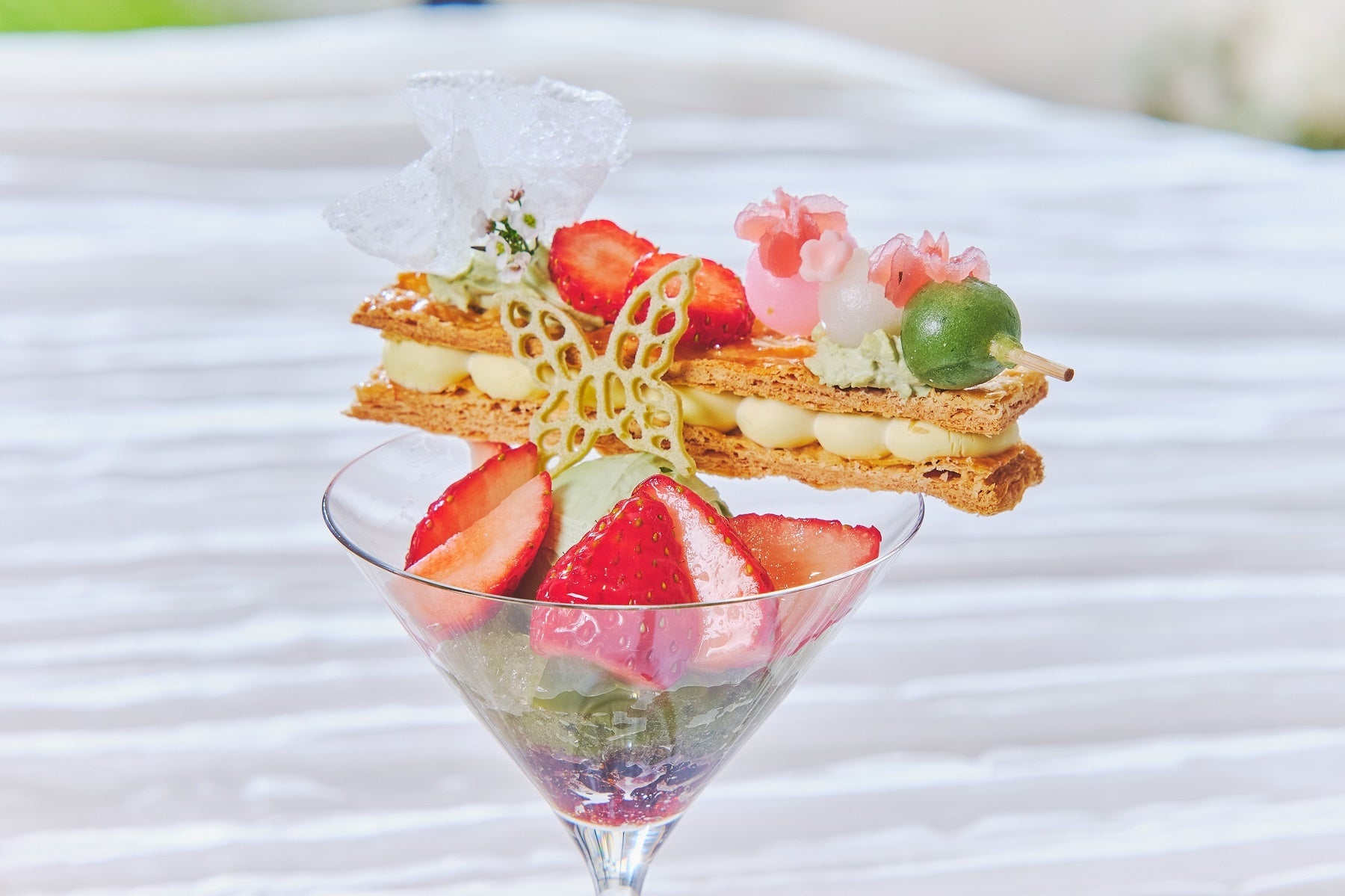 抹茶のジュレ、宇治抹茶の香り高いアイス、三色団子など和と洋をミックスした新緑の息吹を感じられるいちごと抹茶のミルフィーユパフェ。