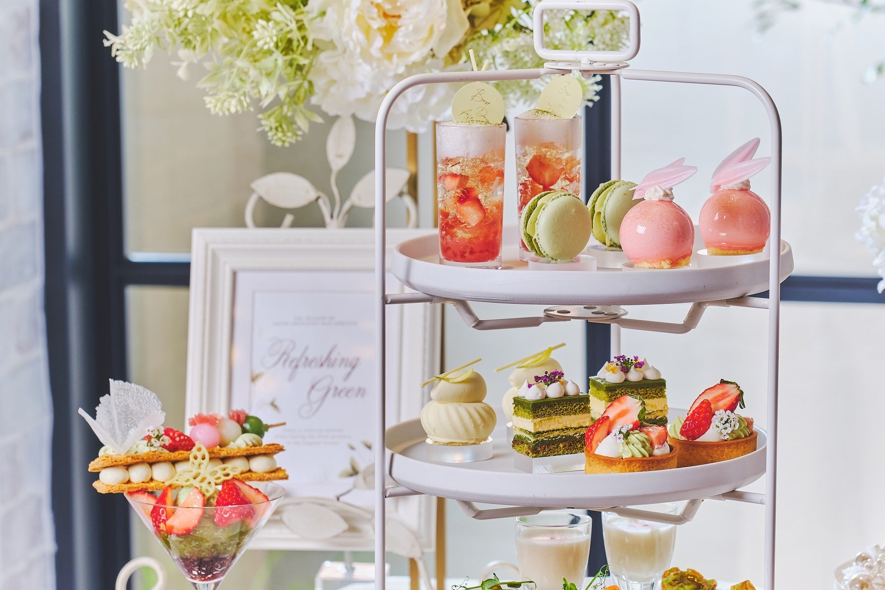 いちごのソースにいちごとシャンパンのジュレを重ね抹茶が香るフォームで仕上げたヴェリーヌ、抹茶のクリームとフレッシュいちごで仕上げた色彩豊かなタルト、さっぱりとしたライムのジュレを忍ばせたいちごのムース、抹茶のガナッシュとミルクチョコレートの層が美しいオペラ、抹茶のジュレと爽やかな柑橘香るホワイトチョコのムース、抹茶のマカロンなどいちごと抹茶のハーモニーを楽しめるスイーツ6種をご用意。