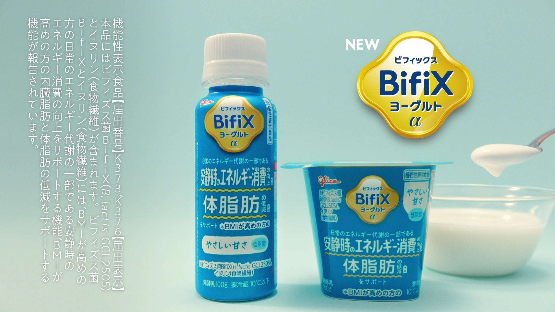 江崎グリコ株式会社は、BMIが高めの方へ向けた機能性表示食品「BifiXヨーグルトα(ビフィックスヨーグルトアルファ)」の新CM「BifiXヨーグルトα登場」篇を、本日2026年3月23日(月)よりWebサイトで先行公開し、4月1日(水)より全国のテレビで放送開始します。
