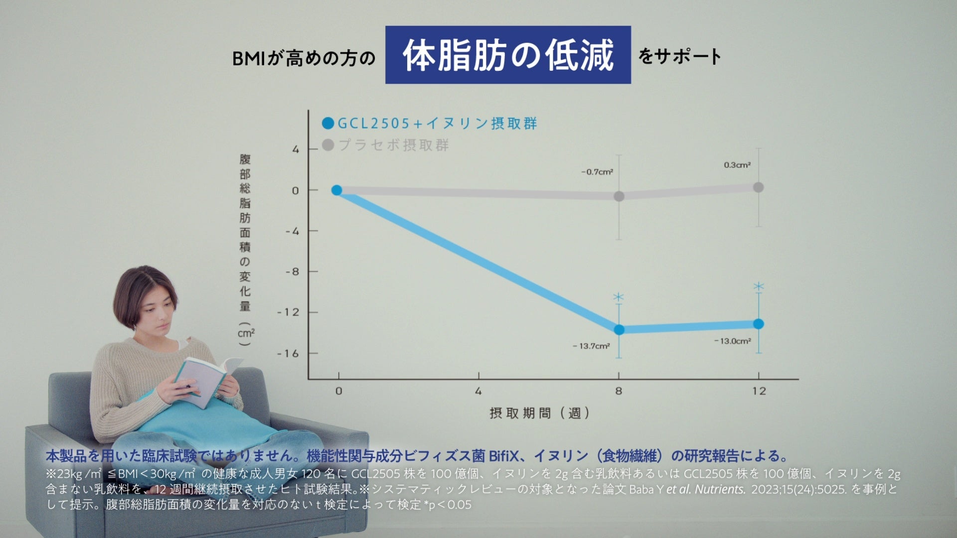 Glicoの研究では、BMIが高め(23以上30未満)の健常な成人男女120名を対象にしたヒト試験の結果、ビフィズス菌BifiX100億個とイヌリン(食物繊維)2gを12週間継続摂取した群は、8週間経過後、プラセボ摂取群より腹部内臓脂肪と腹部総脂肪が低減しました(※5)。今回のCMでは、この研究結果を踏まえ、BMIが高めの方の「安静時のエネルギー消費の向上」と「体脂肪の低減」をサポートする機能を、「Wの効果」として説明しています。