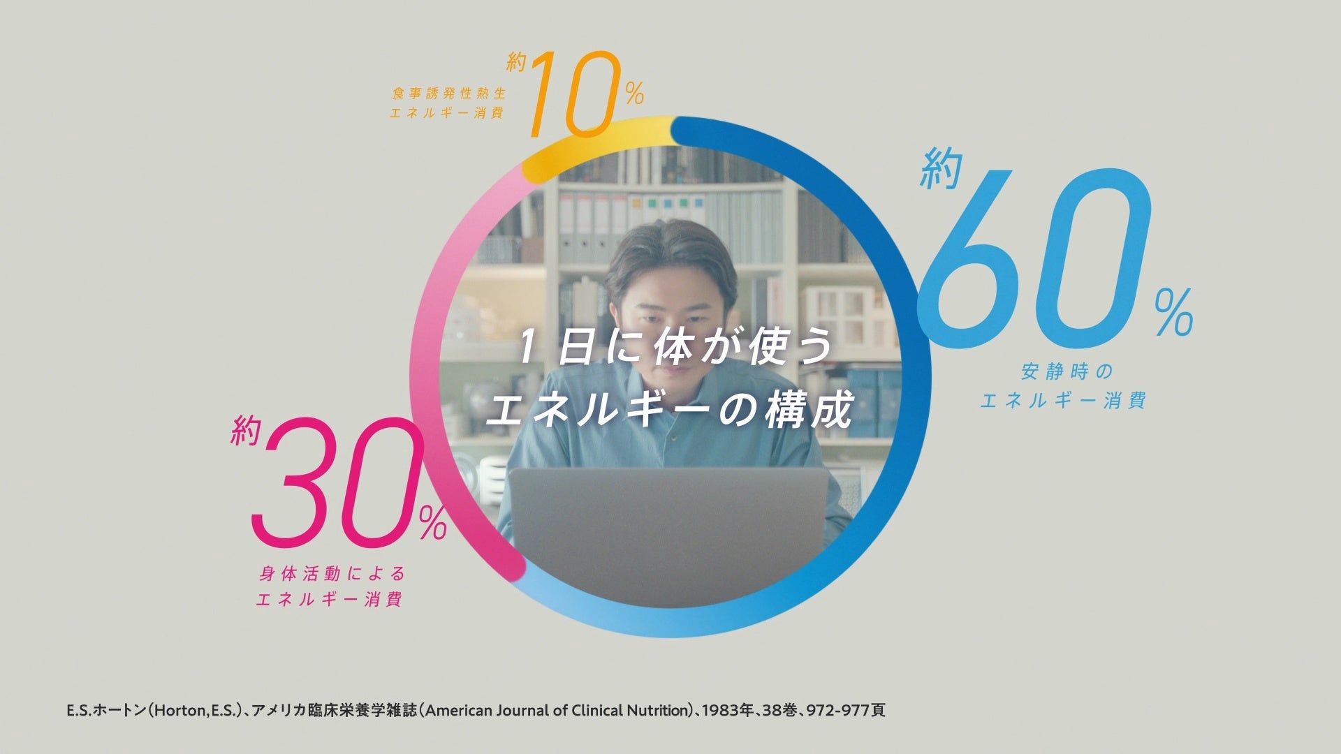 早朝ランニングを終えて、デスクに座りPCで仕事をする人。ジムでのトレーニング後に、リビングのソファでリラックスする人。それぞれの1日の生活を追いながら、運動時と静かに座っている安静時のシーンを対比して描きます。そして、「1日のエネルギー消費量で考えれば、実は、安静時のエネルギー消費が大きい。」というナレーションに合わせて、1日の総エネルギー消費の内訳を示すグラフが登場。運動などの「身体活動によるエネルギー消費」が約30%であるのに対して、1日のエネルギー消費の約60%を占める(※2)「安静時のエネルギー消費」の重要性を分かりやすく伝えます。運動時だけではなく、静かに座っている安静時にもエネルギーはしっかりと消費されているというメッセージです。