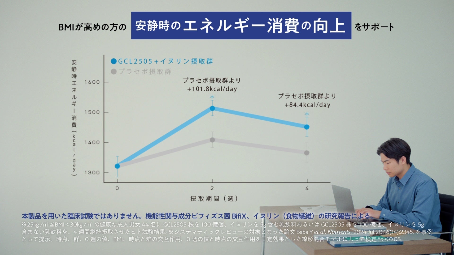 新CMでは、1日の総エネルギー消費のうち、最も大きな割合を占めるのが、静かに座っているシーンなどの安静時エネルギー消費である(※2)と伝えることで、エネルギー消費に関する新たな視点を提案します。また、日本初(※1)の「Wの効果」を支える研究成果についても紹介し、「BifiXヨーグルトα」の魅力を分かりやすく伝えます。「BifiXヨーグルトα」に含まれる「ビフィズス菌BifiX(B. lactis GCL2505)」と「イヌリン(食物繊維)」には、腸内のビフィズス菌と短鎖脂肪酸を増やすことで、BMIが高めの方における日常のエネルギー代謝の一部である安静時のエネルギー消費の向上と、BMIが高めの方の内臓脂肪と体脂肪の低減をサポートする機能が報告されています。