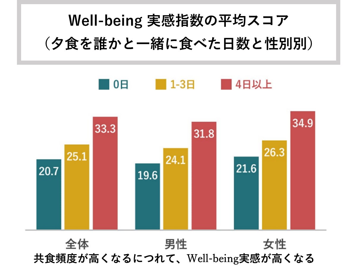 家族や友人と定期的に食事をする「共食」という行動が、人々の生活に果たす役割を理解するために味の素グループで実施したリサーチでは、「共食」の頻度が高い人ほど、Well-being実感が高くなることが示されました。(出典:味の素グループ/ギャラップ2022)