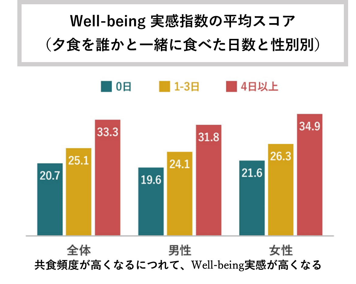 家族や友人と定期的に食事をする「共食」という行動が、人々の生活に果たす役割を理解するために味の素グループで実施したリサーチでは、「共食」の頻度が高い人ほど、Well-being実感が高くなることが示されました。(出典:味の素グループ/ギャラップ2022)